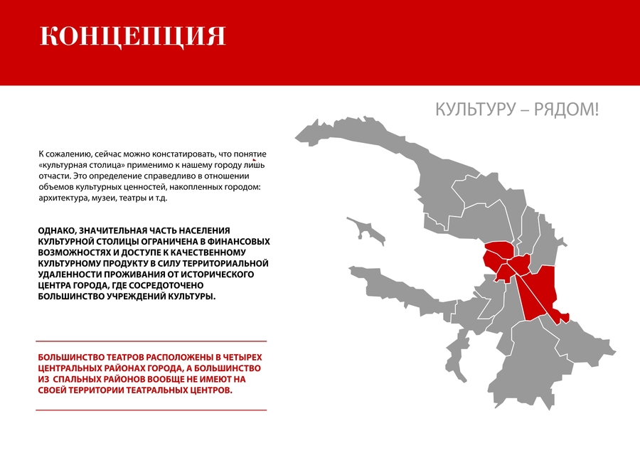 Понятие «культурная столица» применимо к Санкт-Петербургу лишь отчасти. В плане повседневной доступности актуальных современных и качественных творческих продуктов, например театрального искусства, регион, занимающий столь большую площадь, не может похвастать развитой и равномерно распределенной по территории инфраструктурой. Практически все культурные центры расположены в историческом центре мегаполиса.