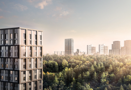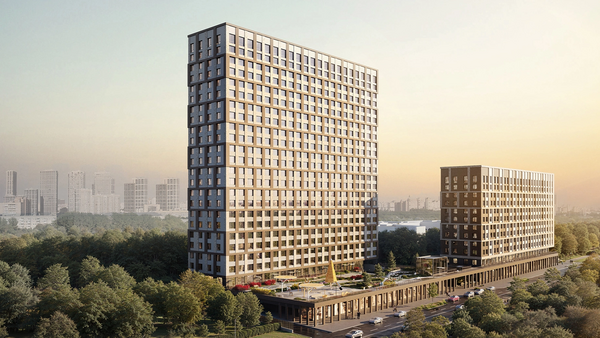 Архитектурная концепция и фасад: -Авторская работа бюро APEX и Остоженка. Комплекс позиционируется как город‑курорт, отражающий идею спокойной жизни у воды -Фасады облицованы крупноформатным керамогранитом и бетонной плиткой различных близких оттенков серого и бежевого, создавая сдержанную благородную палитру -Вертикальные акценты фасадов подчеркнуты встроенной подсветкой, что придает зданиям выразительный силуэт и вечернюю динамику