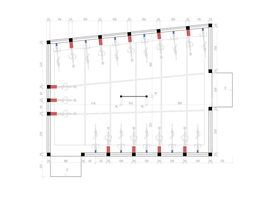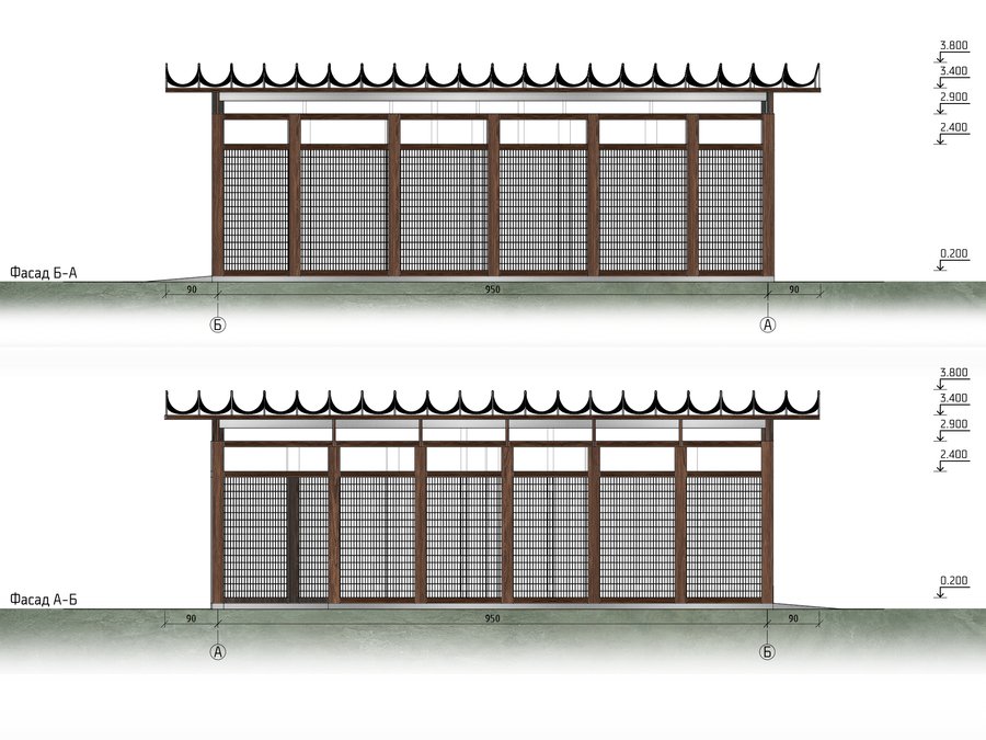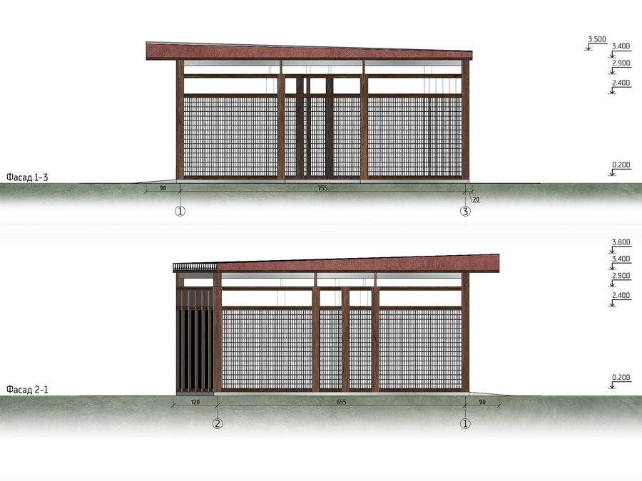 01| Стилобат (бетон + стекло+ металлические рейки) 02| Каркас (деревянные рейки 20×20 см + металлическая сетка + металлические листы) 03| Крыша (деревянные рейки 42×2 см + металлические листы + HPL панель) 04| Лайтбоксы (деревянные рейки, каркас боксов + светорассеиватель + лампы с параметром IP65) 05| Крепежи (металлические изделия)