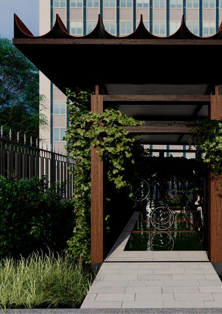 Наш проект велопарковки — это объемная конструкция из дерева и металлической сетки, по которой растёт зелёная лоза. Со временем она образует живую стену, которая меняется с сезонами и создаёт ощущение уединения. Крыша с выразительным силуэтом защищает от осадков, но остаётся светопроницаемой. Внутри — стеклянный пол с растениями под ним и мягкое освещение от лайтбоксов наверху. Парковка вписывается в архитектуру ФОКа и поддерживает связь с природой на уровне материалов и ощущений.