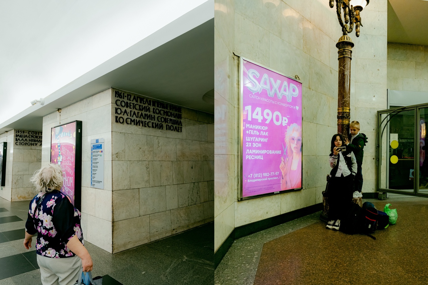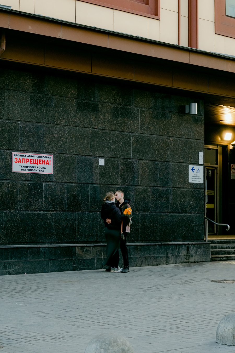 Пятница Когда я приехала на Звенигородскую, небо отчего-то хмурилось. В такую погоду можно задержаться в вестибюле станции, где размещается самое большое мозаичное панно петербургского метрополитена (его длина — 20 метров, высота — 4), но ненадолго, поскольку на выходе из метро рождается большая любовь, которую мне удалось сфотографировать дважды — прошедшей весной и наступившей осенью.