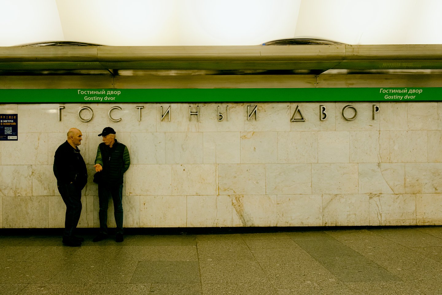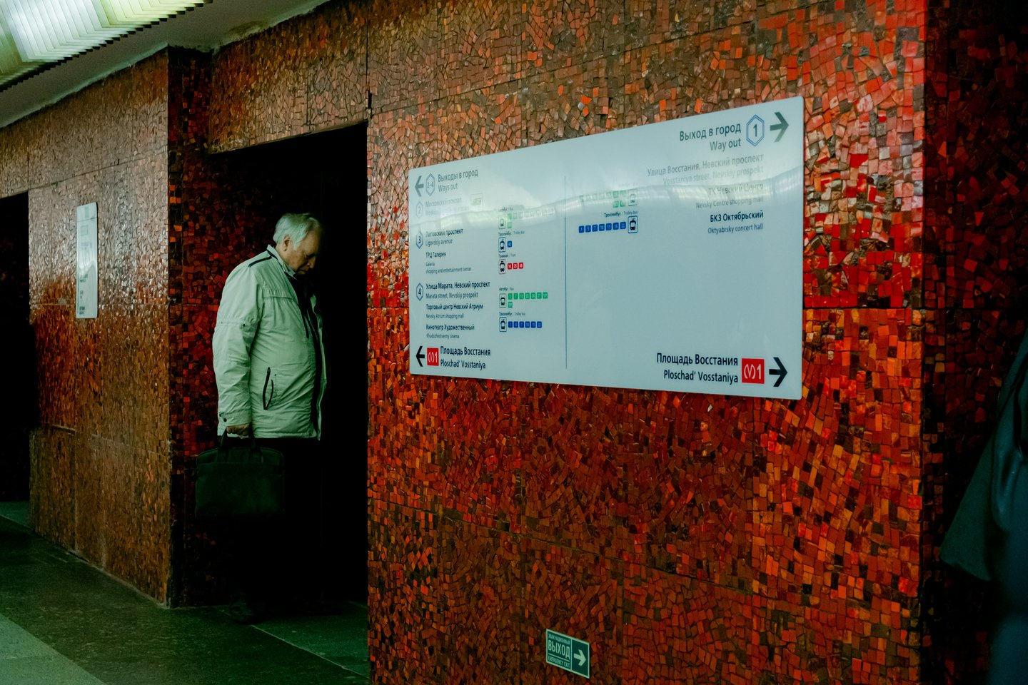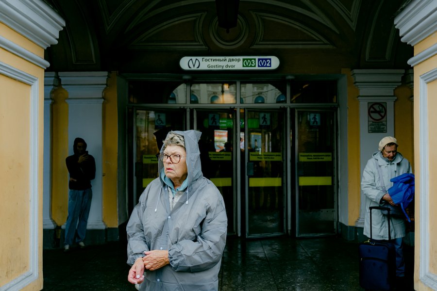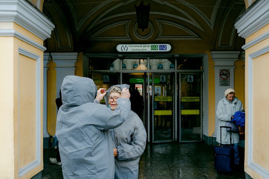 Понедельник Когда я приехала на Гостиный двор, дождь в пятый раз за день обрыдал тротуары. Мне пришлось, как и полагается местной жительнице, объяснить иностранцу, к какому выходу ему целесообразнее направиться, поскольку собственные воззрения необходимо подкреплять практикой, а станция вызывает у меня гостеприимные ассоциации из-за названия и благодаря замеченной через 135 секунд (столько времени занимает подъём на эскалаторе к выходу в город) ситуации.