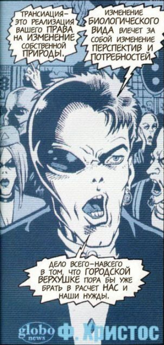 Общество в комиксе потребляет информацию так же хаотично, как и генно модифицированную еду. Люди могут добровольно превращаться в инопланетян ради новых ощущений. Это метафора потери человеческой идентичности в погоне за новизной и бегстве от реальности.
