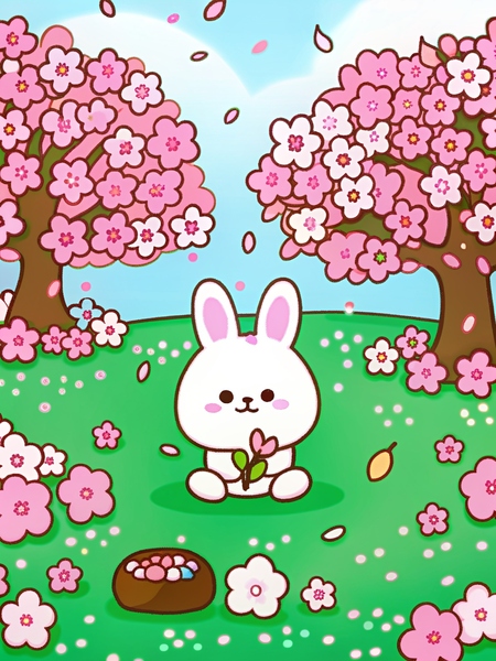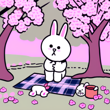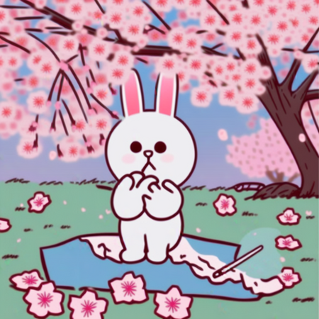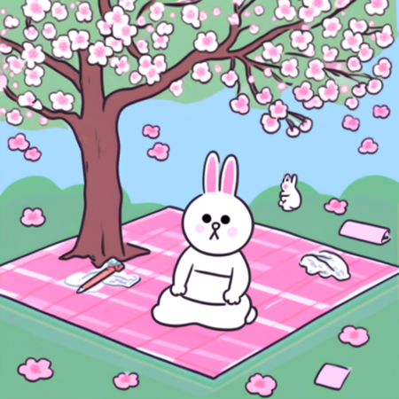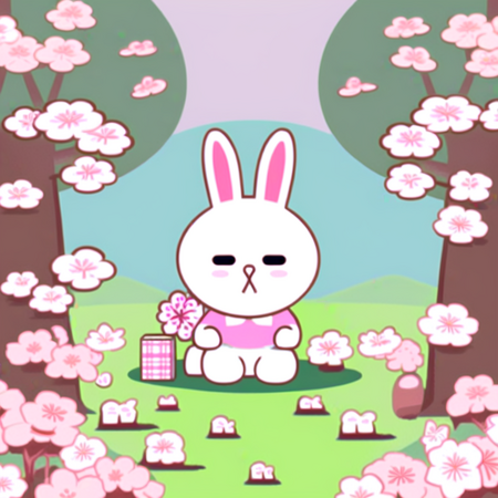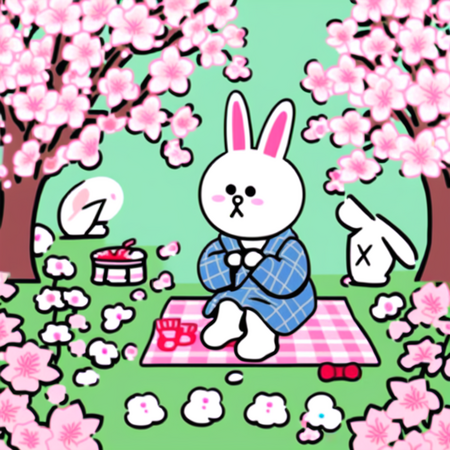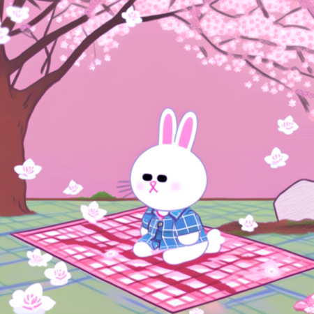Промпт: a photo collage in SPRINGLINEFRIENDS style, a drawing of one WHITE RABBIT sitting on a plaid on the ground under a cherry blossom tree, clear delicate pastel natural colors, light blue sky background, pink sakura trees and green ground, sharp focus, intricate details