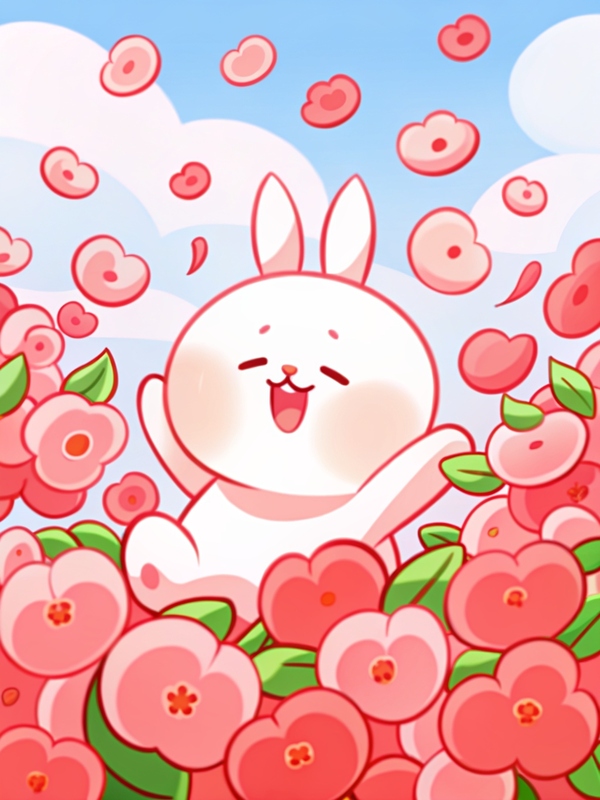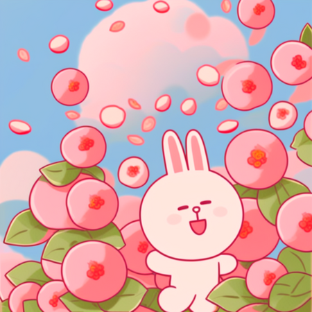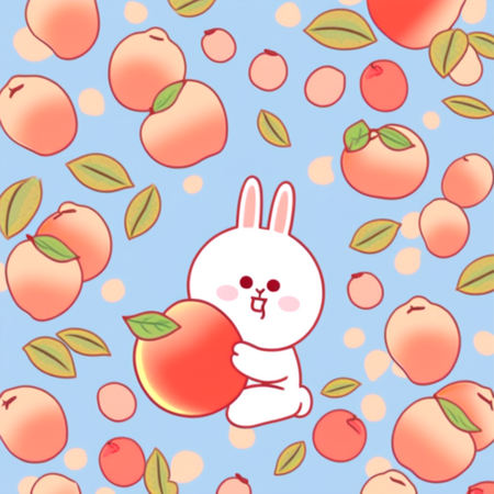 Промпт: a photo collage in SPRINGLINEFRIENDS style, one happy bunny centered, surrounded by japanese peaches with soft leaves, smiling, playful, soft pastel background, blue sky, spring vibes, kawaii feeling