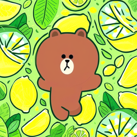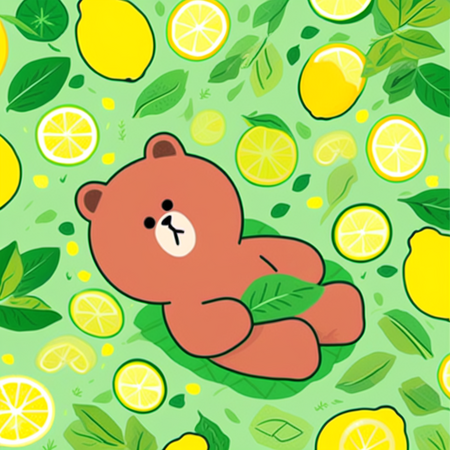 Промпт: a photo collage in SPRINGLINEFRIENDS style, one cute brown bear smiling, playful, lying on green grass, surrounded by bright yellow lemons with leaves, soft pastel colors, spring vibes, kawaii atmosphere
