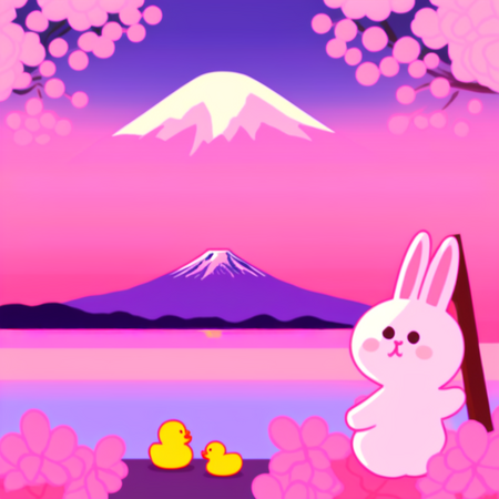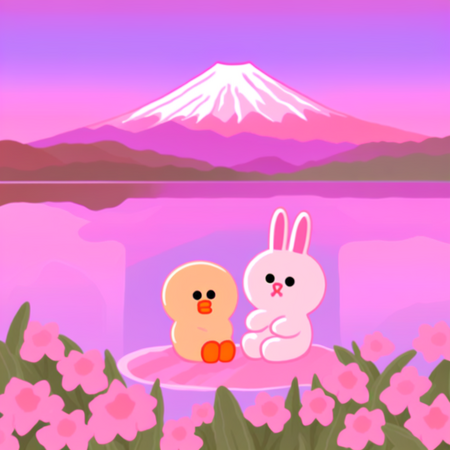 Промпт: a photo collage in SPRINGLINEFRIENDS style, one bunny and one small duck sitting together, watching Mount Fuji, warm pastel sky, soft pink and blue tones, peaceful spring vibes, kawaii atmosphere