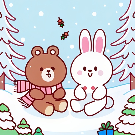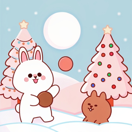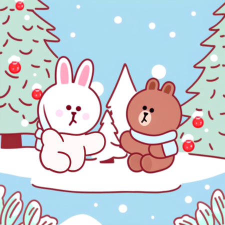 Промпт: a photo collage in SPRINGLINEFRIENDS style, a drawing of one white rabbit and one brown bear playing snowballs outside in winter, a Christmas tree on the background, playful, soft pastel background, blue sky, winter vibes, kawaii feeling