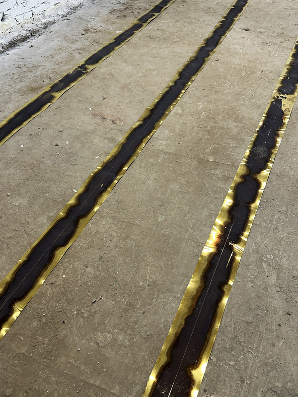 Тотальная инсталляция «Л63» — это фиксация процесса перехода блестящего металла в его разложение. Патиновая тропа, проходящая по поверхности листов латуни распространяется словно вирус, создавая аномалию. Однако разрушение не стирает следов — оно их создает.