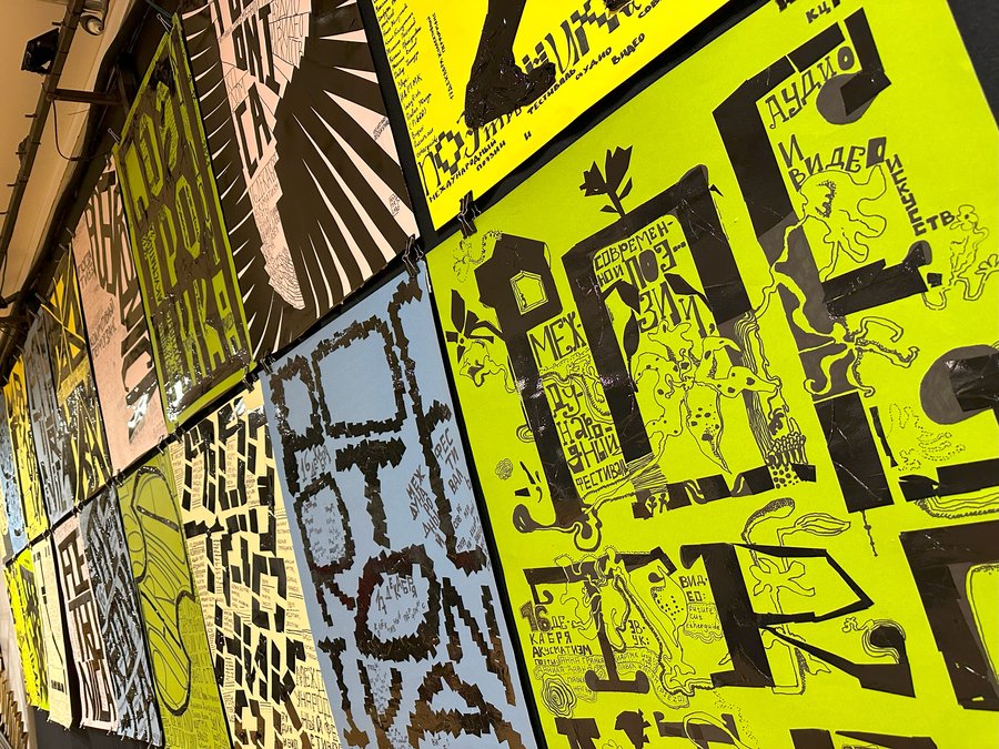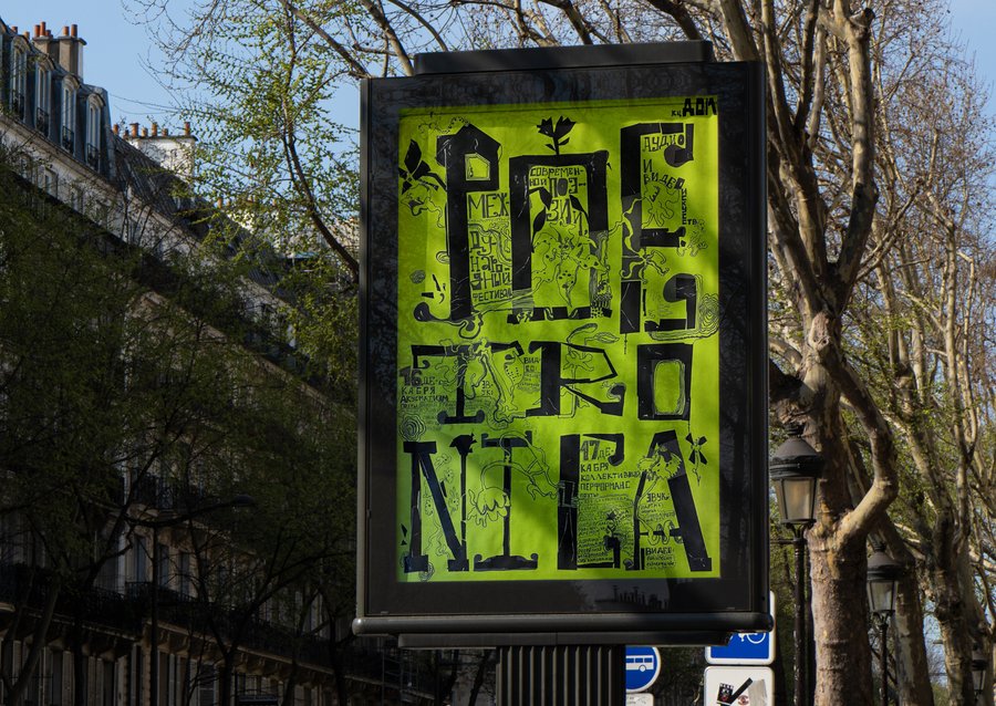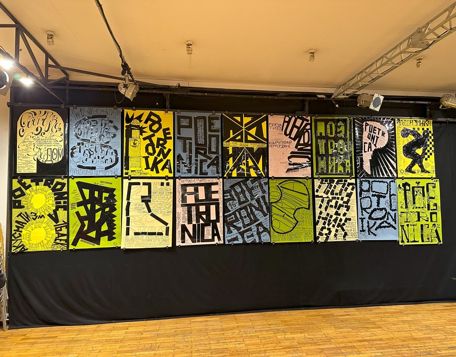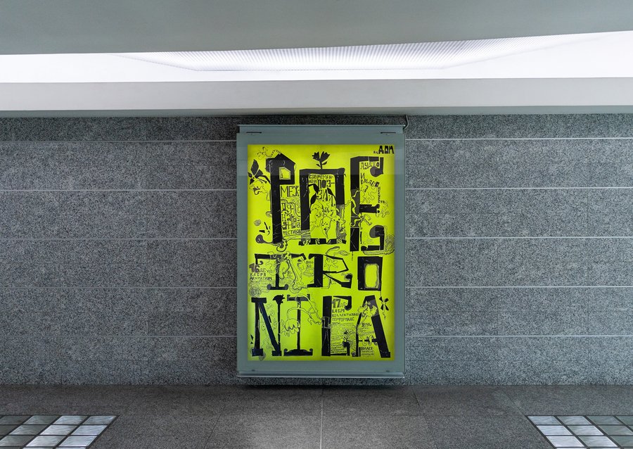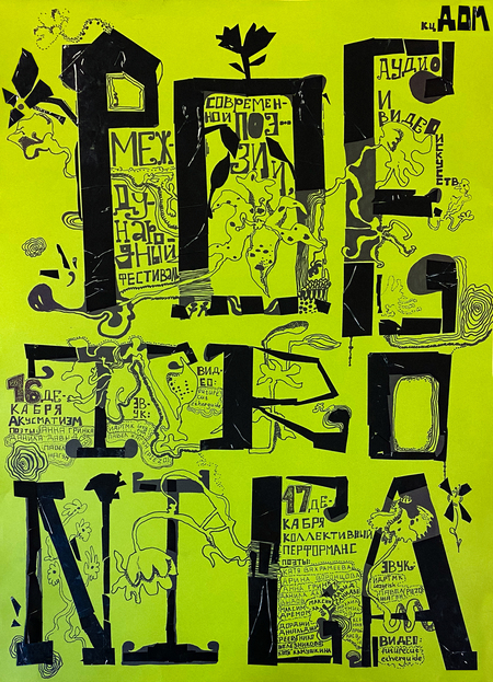 Plate for the International Festival of Modern Poetry, Sound Art and Video Art, «Poetronica» at the SC DOM. I used black scotch, markers and paper to create the poster. Inspired by flowers. They wrap the letters around it. The large letters are made with black scotch, and the rest with markers.