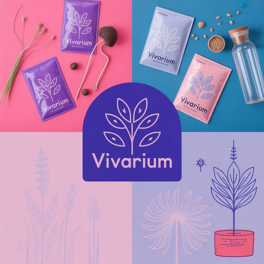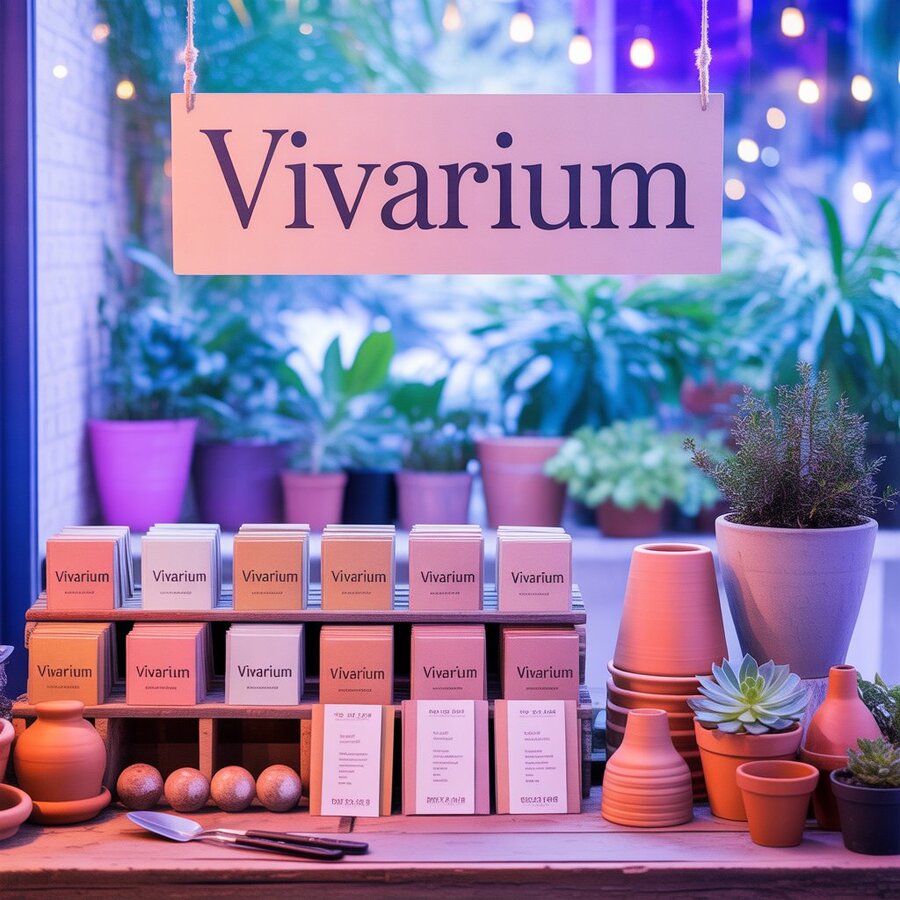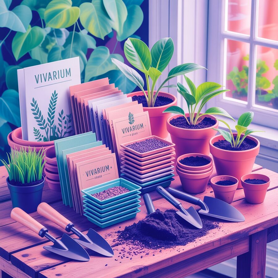 create a corporate identity for a botanical plant and seed store called Vivarium. The image should include packs of seeds and other gardening items ideogram.ai