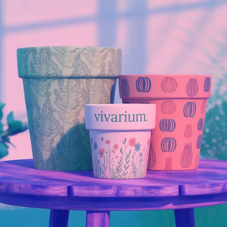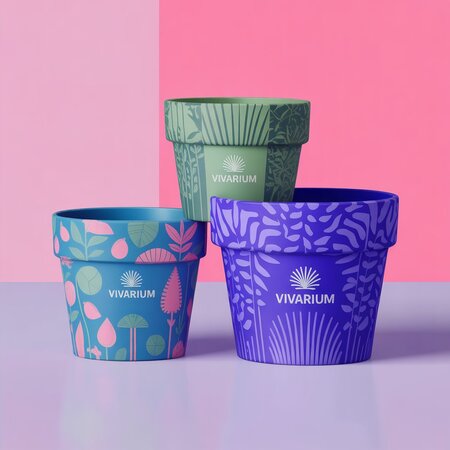 create a mockup with branded plant pots for a botanical plant and seed store called Vivarium. The pots should have beautiful plant patterns