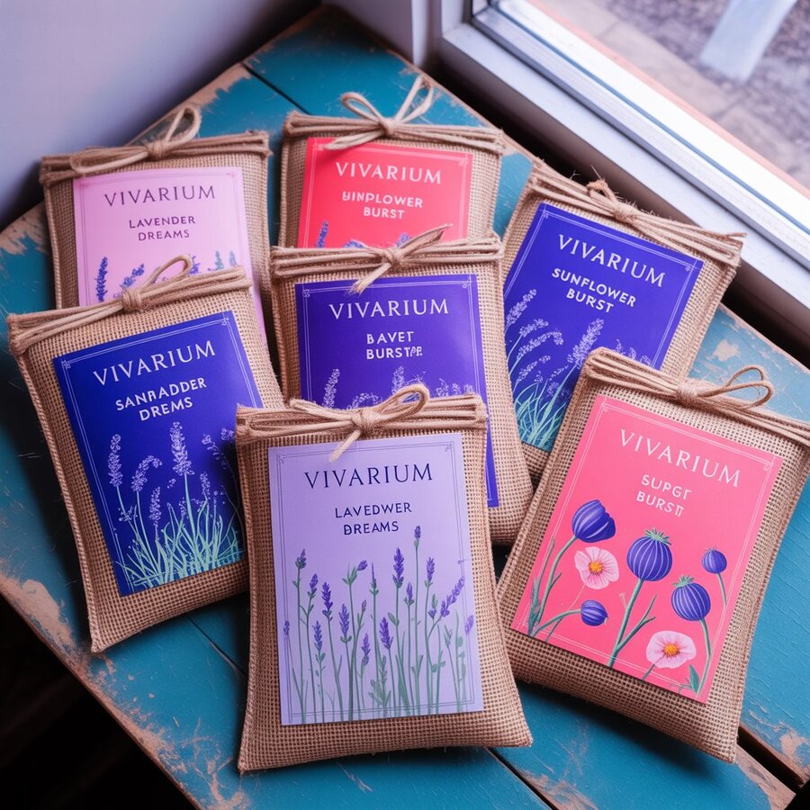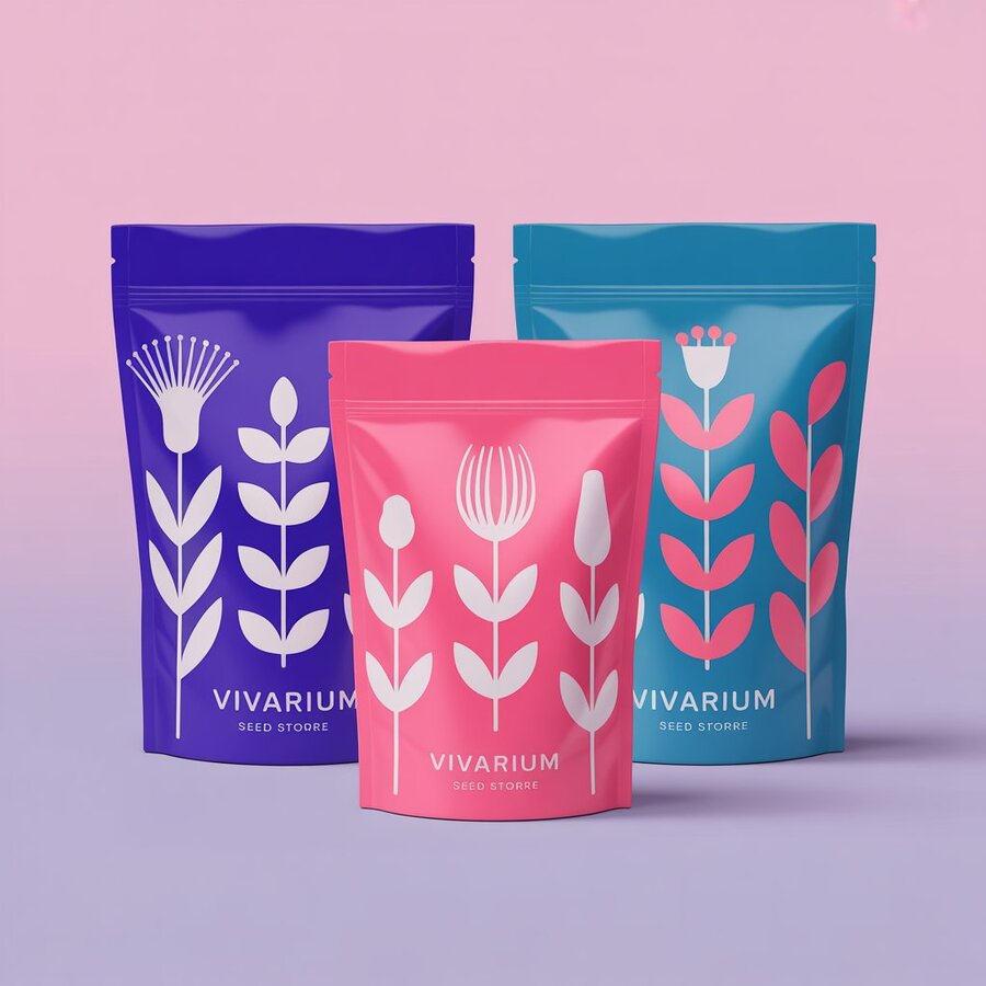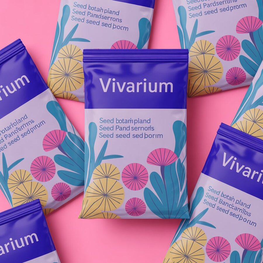create a mockup with branded seed bags for a botanical plant and seed store called Vivarium. The bags should have seed names and seed patterns