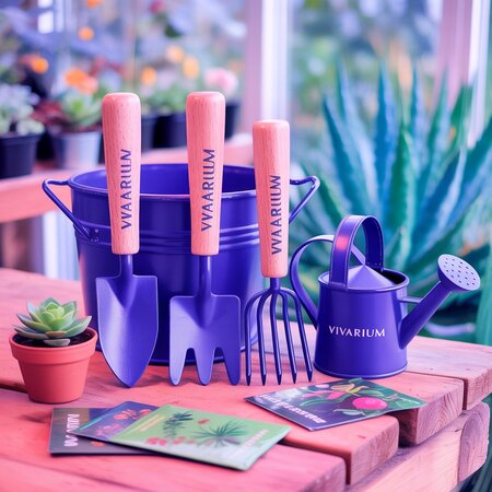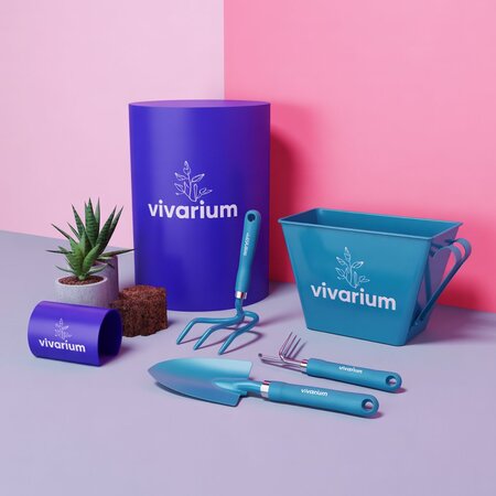 Create a mockup with branded gardening tools for a botanical plant and seed store called Vivarium