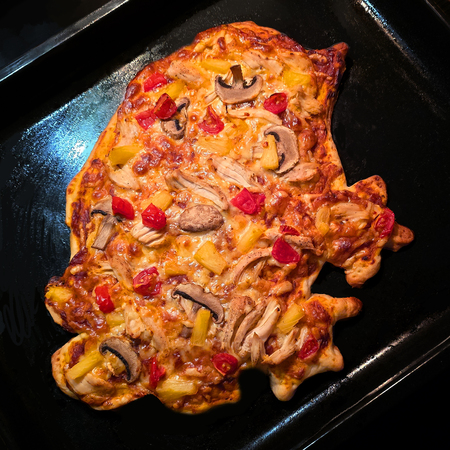 Для начинки: Ананас — по вкусу* Курица — 100 г* Помидоры черри — по вкусу* Шампиньоны — 2-3 штуки* Сыр моцарелла — 150 г Сыр гауда — 50 г Томатный соус — по вкусу Орегано* Базилик*