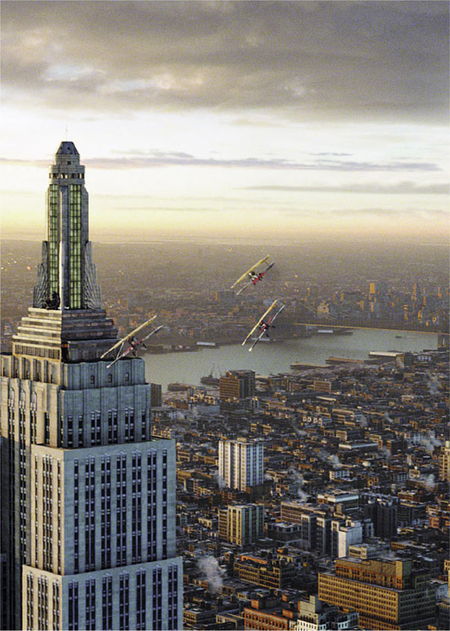 Решение создать город (Нью-Йорк 1933 года) синтетическим путем было основано на положительном опыте Джексона (режиссера) в использовании того же подхода в финале «Властелина колец». Но они знали, что невозможно построить каждое здание, поэтому чтобы нанести на карту территорию города, супервайзер по цифровым эффектам Дэн Леммон использовал спутниковые снимки и коммерческую 3D-модель Манхэттена, сделанную примерно в 2001 году. Для визуализации было выбрано 4 квартала, формирующих как бы букву V.