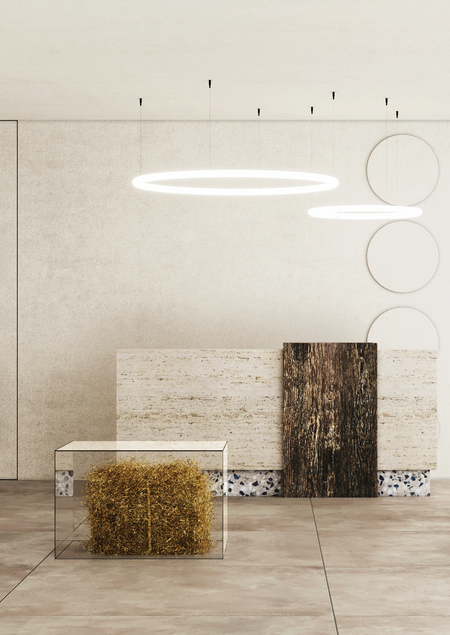 Общая площадь: 1364.4 м². Цветовая гамма: кремовая пыльная палитра с голубыми вкраплениями, напоминающими сыр с плесенью, черные графичные линии. Материалы: травертин, брашированное дерево, известковая штукатурка, терраццо, стекло, металл. На этажах 2 и 3 с южной стороны предусмотрены раздвижные ширмы от солнца, позволяющие комфортно смотреть экспозицию в солнечные дни.