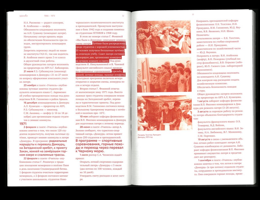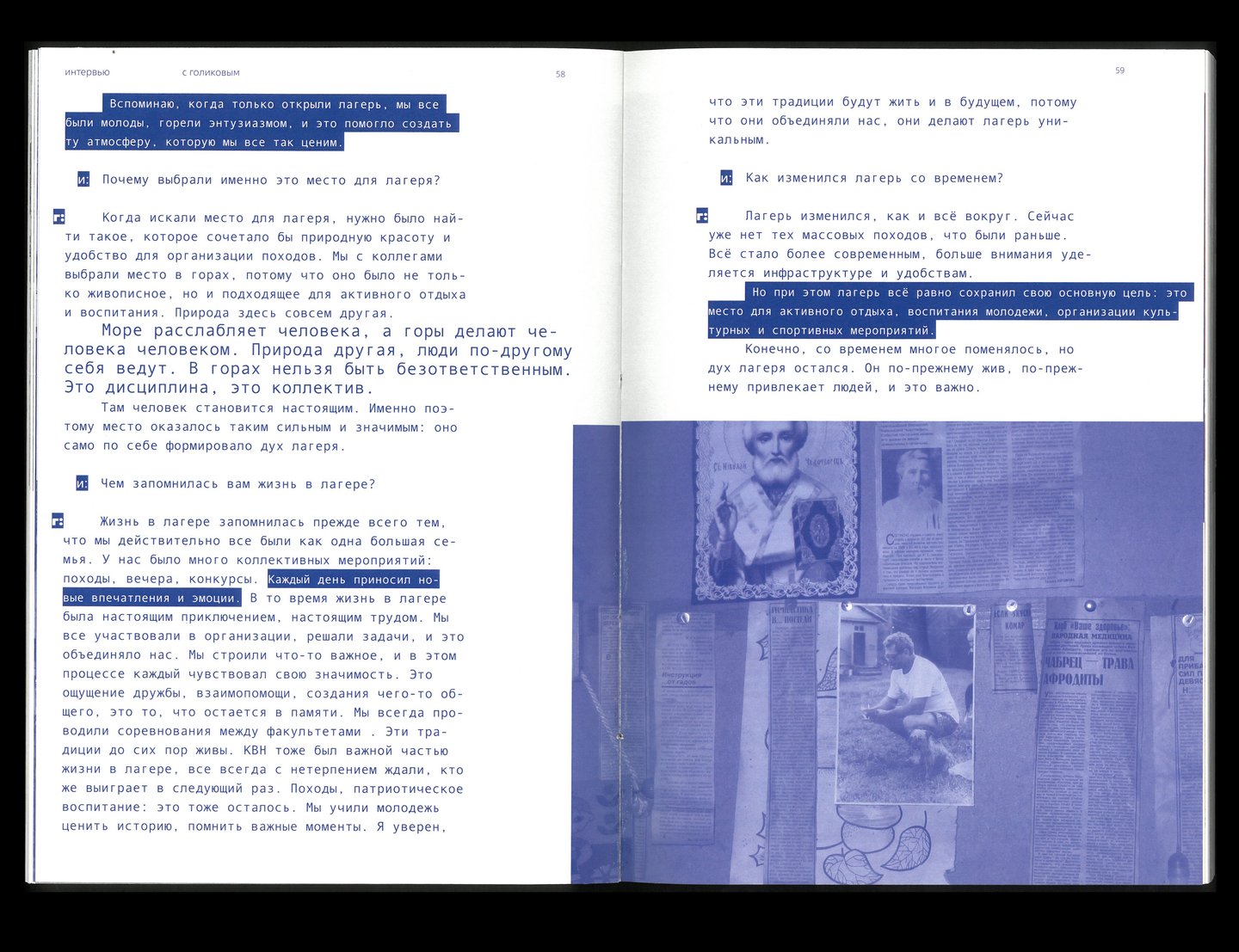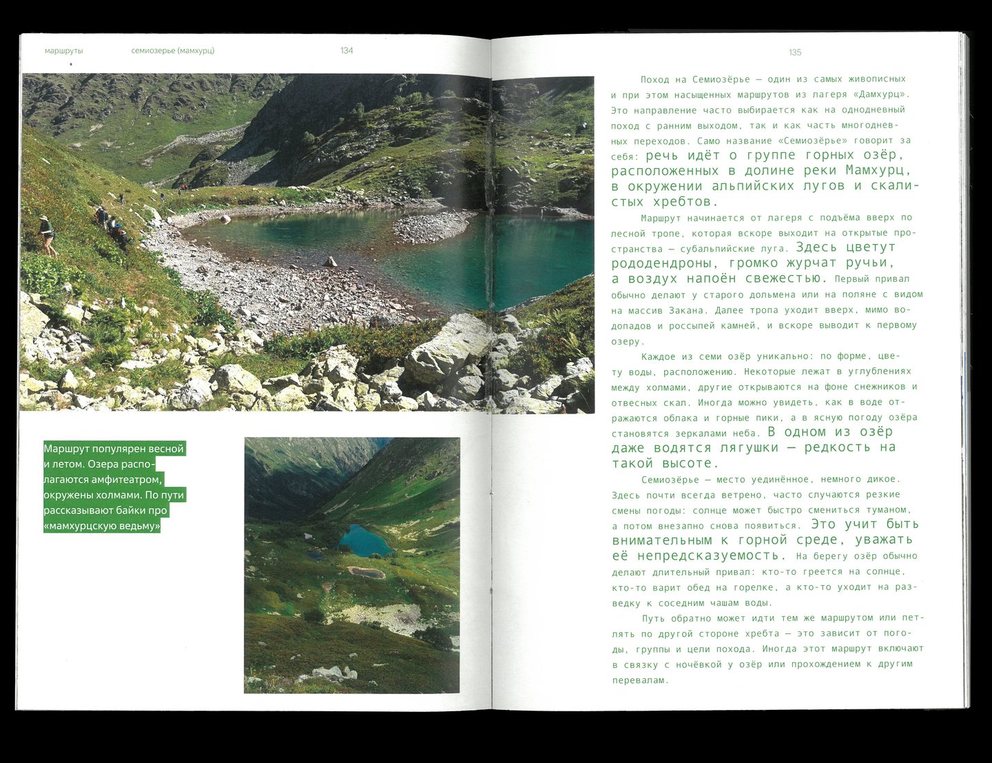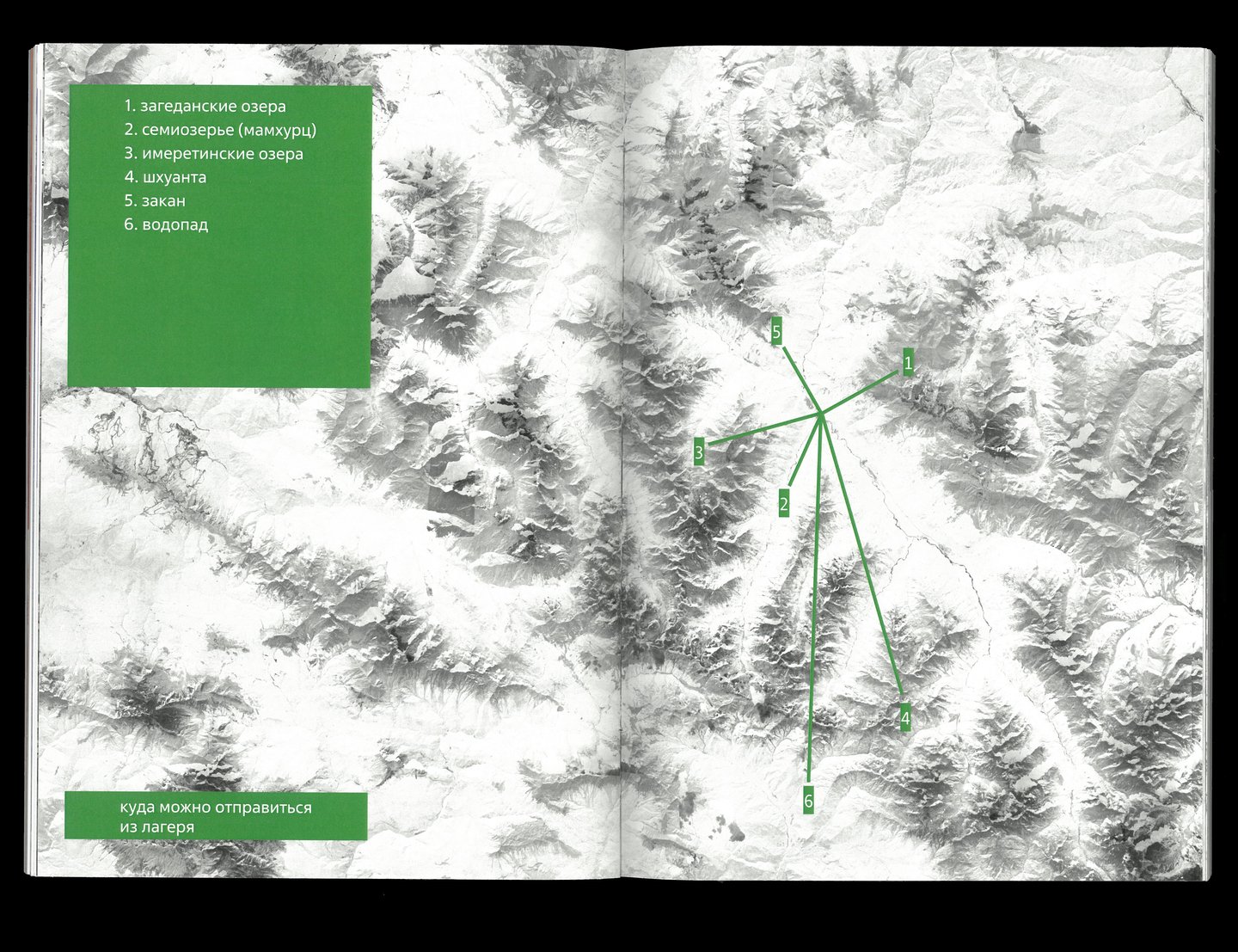 книга посвящена студенческому лагерю и поделена на 3 основных раздела: хроники, интервью и маршруты, которые маркируются цветом. Помимо них в книге присутствуют развороты с фотографиями как архивными, так и современными