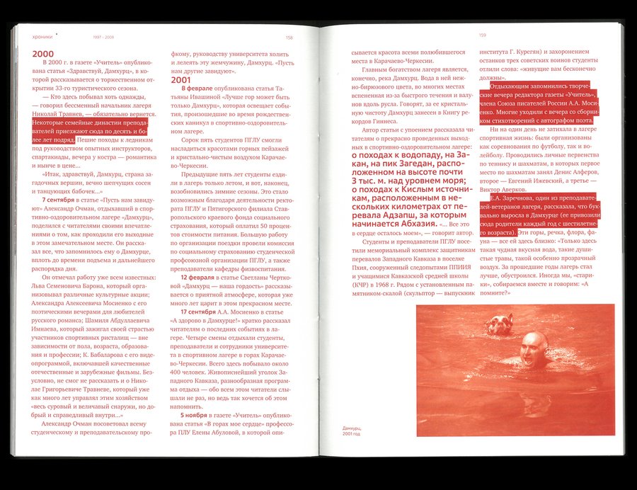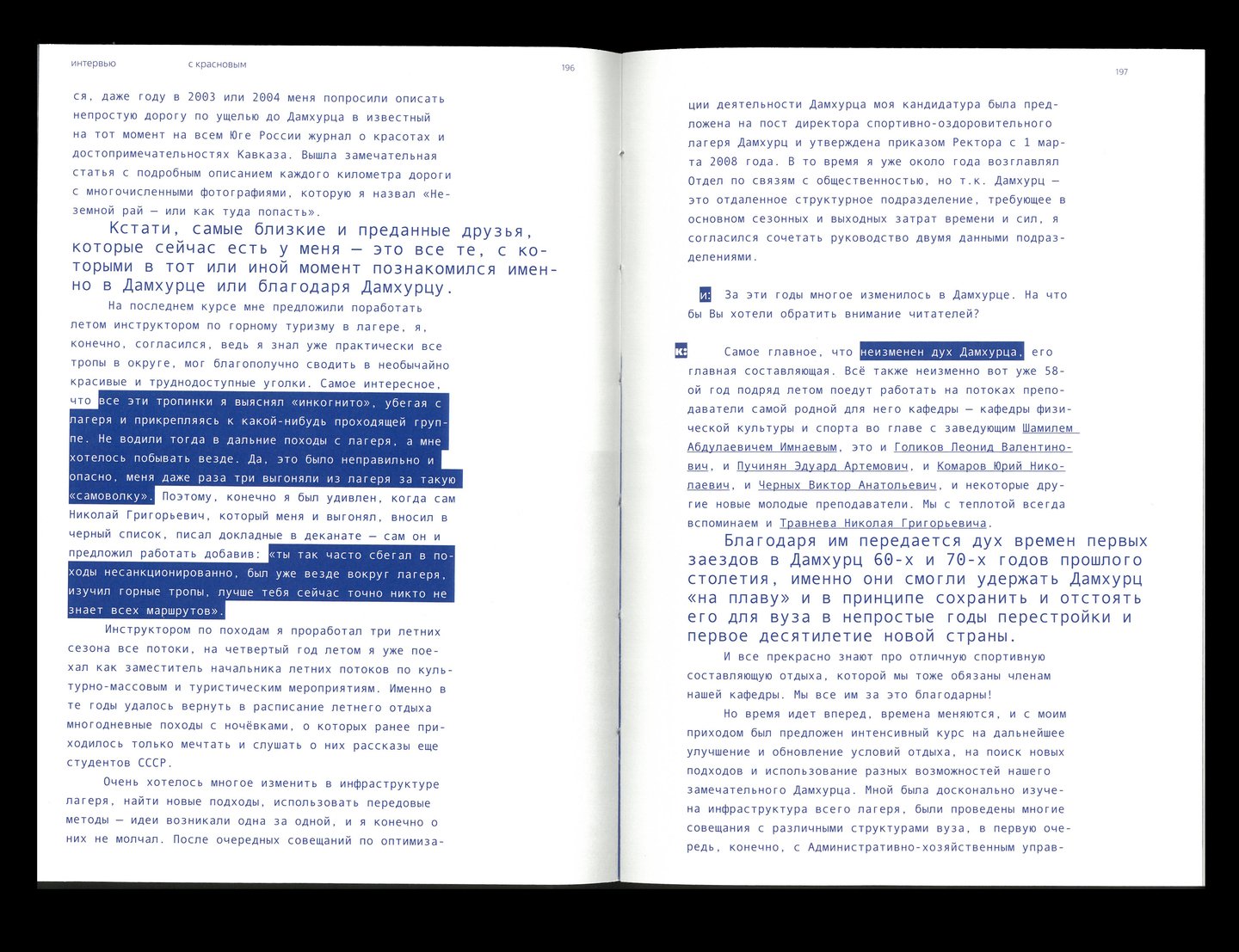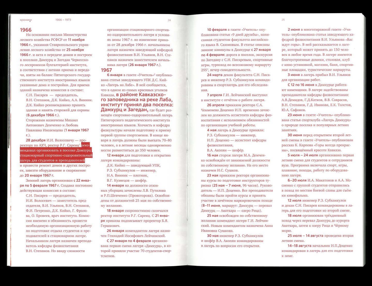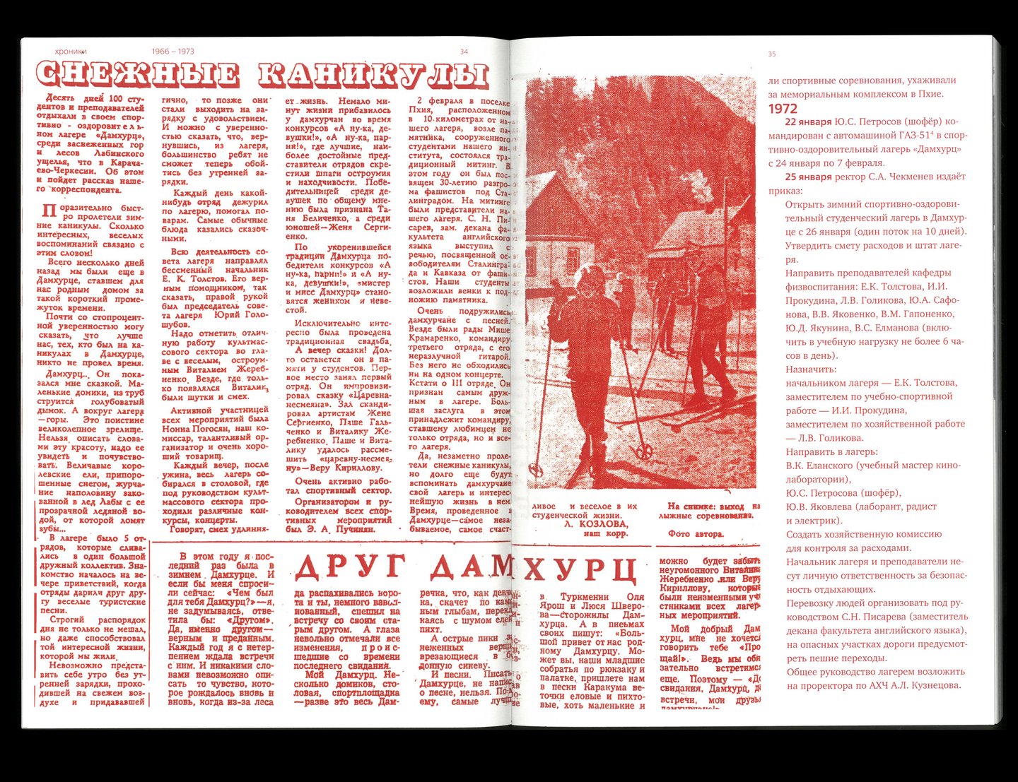книга посвящена студенческому лагерю и поделена на 3 основных раздела: хроники, интервью и маршруты, которые маркируются цветом. Помимо них в книге присутствуют развороты с фотографиями как архивными, так и современными