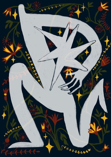 В дополнение к основной иллюстрации я работала над текстильным панно, в котором использовала визуальный язык средневековых гобеленов, а также более поздних произведений текстильного искусства, отсылая к движению Arts& Crafts, которое поставило перед собой цель распространить ремесло и ручной труд во времена, когда промышленное производство уже не удовлетворяло запросы художественного сообщества, штампуя одинаковые, некачественные вещи.