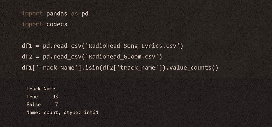 Будучи большой поклонницей творчества Radiohead, я с особым трепетом и интересом подошла к этому исследованию. В качестве анализируемого материала я выбрала две базы данных (Radiohead Song Lyrics и Radiohead Gloom Index Songs) с сайта Kaggle.