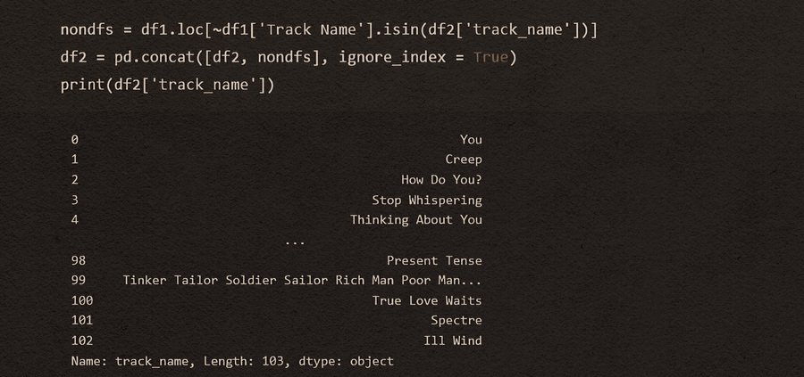 После объединения баз данных я добавила недостающую информацию (которая впоследствии пригодится в анализе) по таким параметрам песен, как danceability, energy и loudness, из Spotify Web API и создала новый файл Radiohead_final.csv