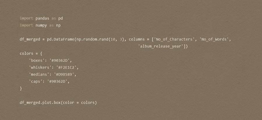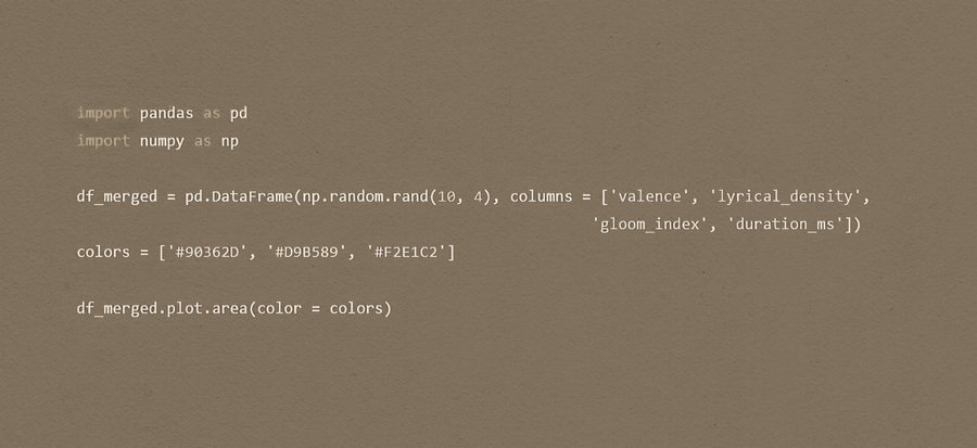 1. Код с первым применением цветовой палитры. 2. Пробный вариант Area Plot графика, поиски. 3. Код с попыткой имплементации цвета график с линиями. 4. Пробный вариант Box Plot графика.