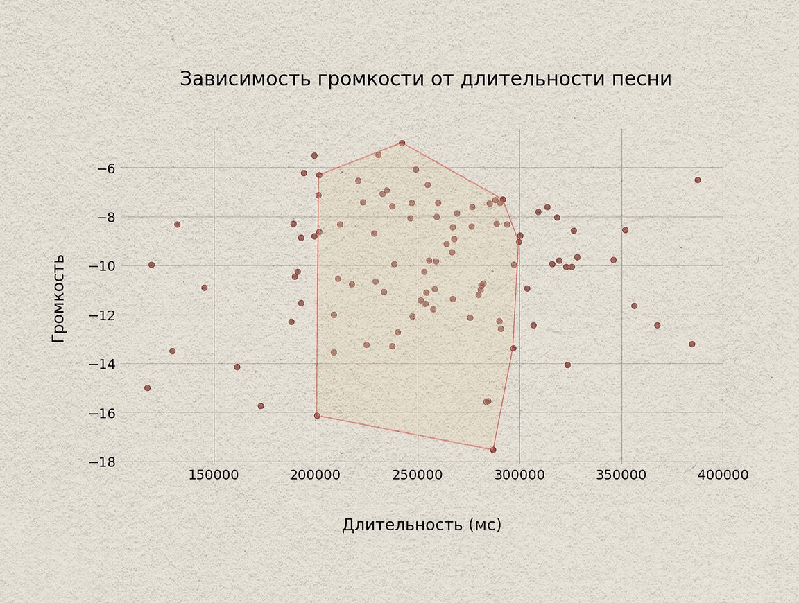 Обращаясь к графику зависимости громкости от длительности песни, становится очевидно, что самые громкие песни находятся в примерном диапазоне от 200000 мс. до 300000 мс., что наглядно обозначается на графике отдельной фигурой.