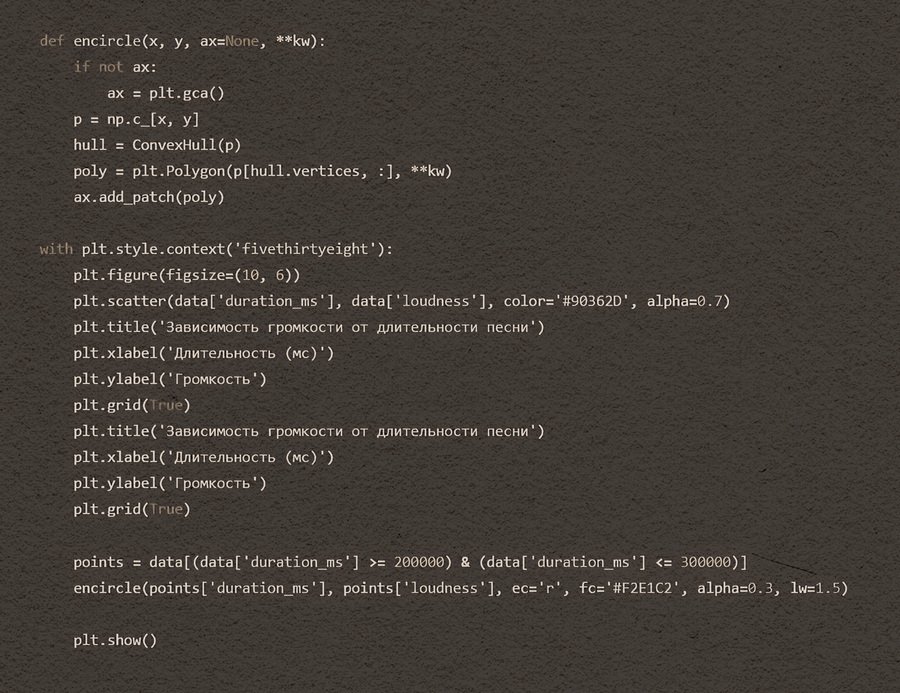 В пузырьковой диаграмме зависимости громкости композиции от ее длительности мне захотелось акцентировать внимание на участке с, как мне показалось, большим количеством точек. Для этого я использовала функцию encircle () и с помощью Chat GPT6 имплементировала ее в программу.