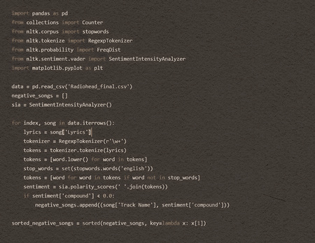 В своем анализе я опиралась на лингвистические и структурные особенности текстов песен Radiohead. Для этого я использовала библиотеку VADER (Valence Aware Dictionary and sEntiment Reasoner), специально созданную для анализа настроения текста и выделения позитивного, негативного и нейтрального эмоционального контента.