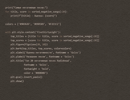Второй датасет, который я взяла и объединила с первым, изначально рассчитывал индекс «мрачности» и негативности песен Radiohead и был основан на исследовании дата-сайентиста Чарли Томпсона. Я изучила комментарии пользователей: оказалось, в большинстве случаев слушатели не согласны с результатами его анализа.