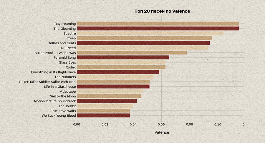 energy: описывает позитивность музыки. Треки с высоким valence звучат более позитивно (например, счастливо, жизнерадостно, эйфорично), в то время как треки с низким valence звучат более негативно (например, грустно, подавленно, сердито).