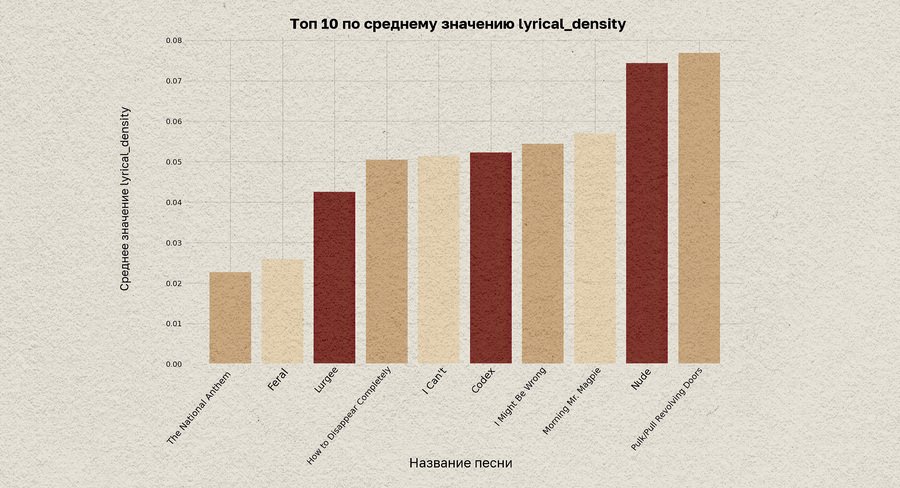 Следующий график иллюстрирует среднее значение лирической плотности (lyrical_density) для каждого альбома Radiohead. Этот параметр демонстрирует, какую долю от длительности трека занимают слова.