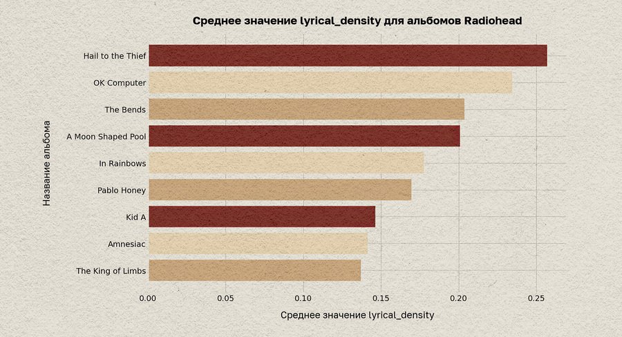 — сравнение альбомов Radiohead по параметру лирической плотности (lyrical_density)