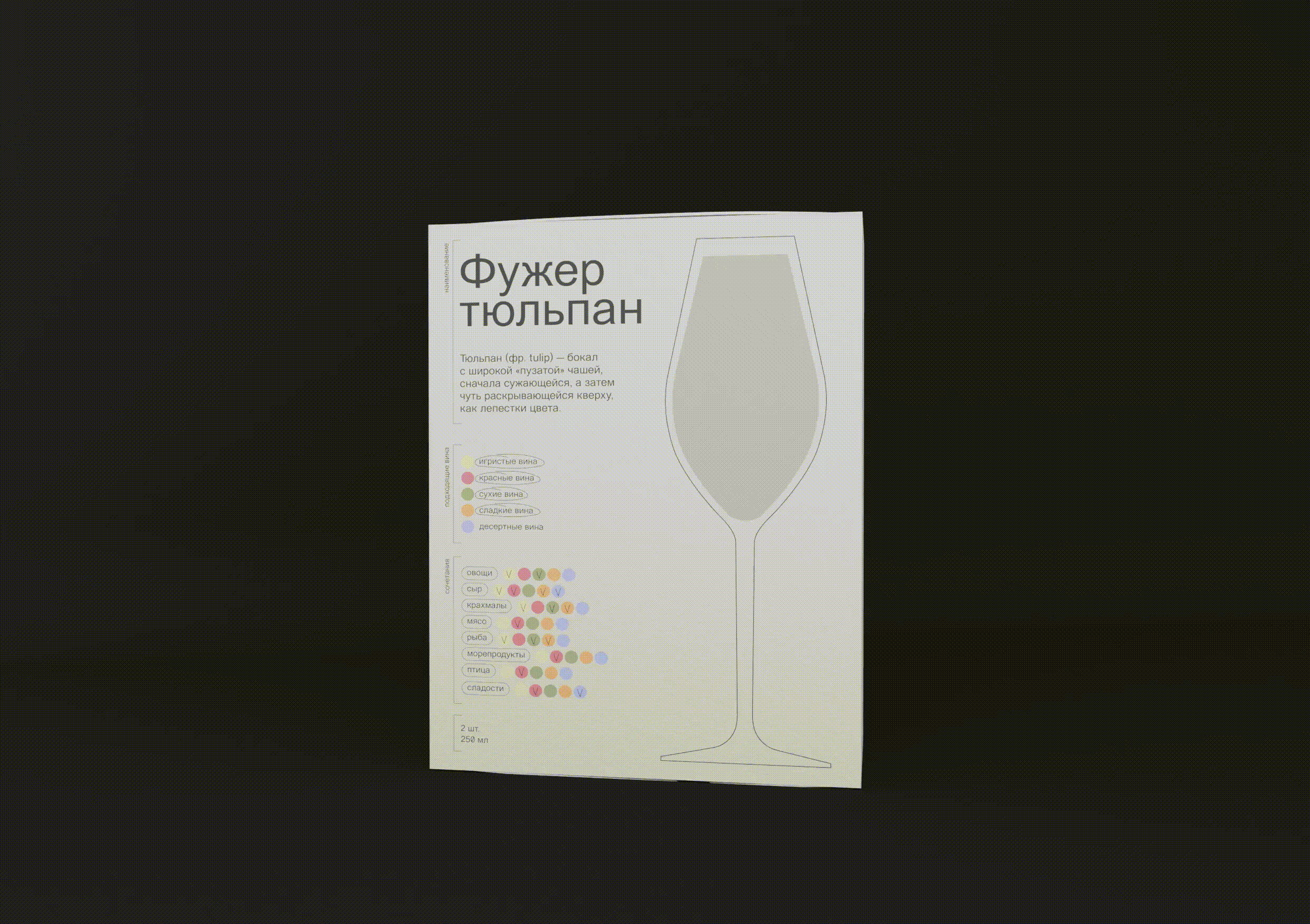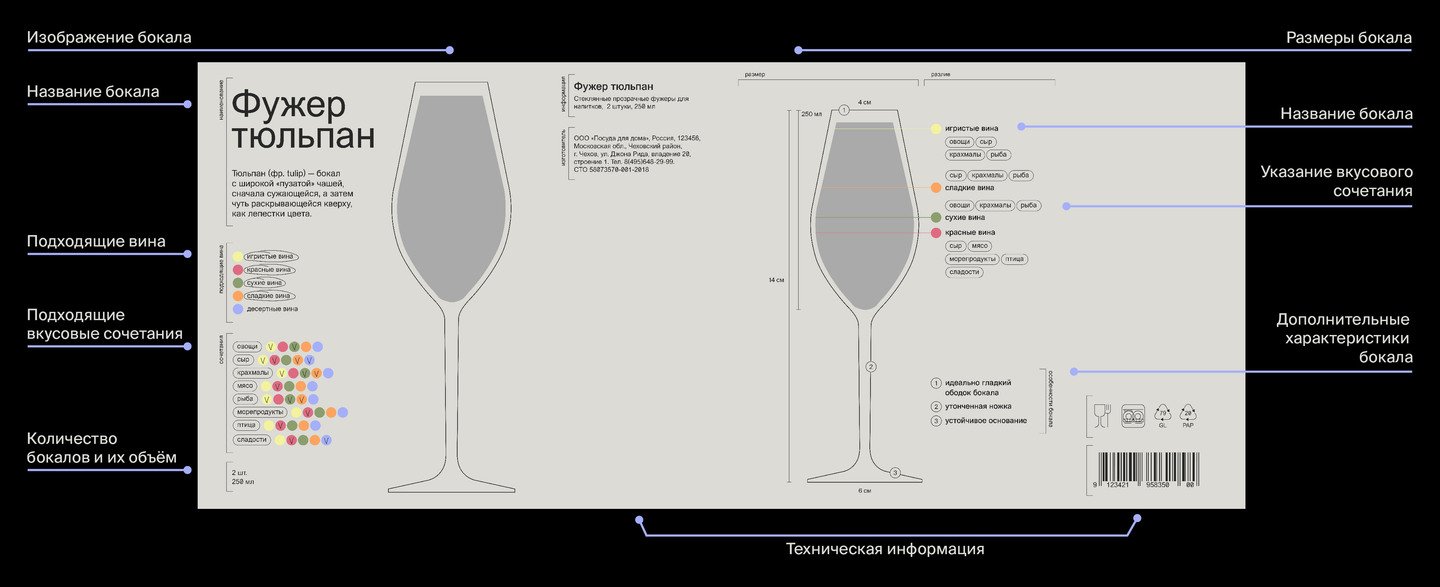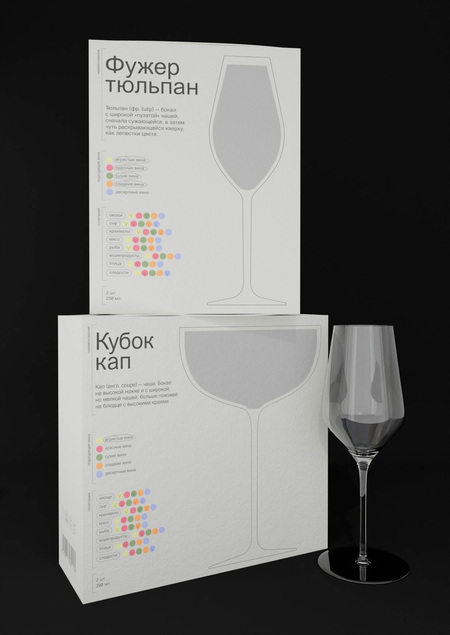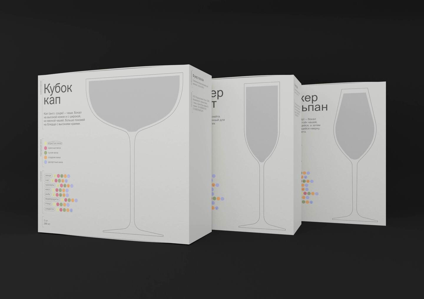 Инфографичная упаковка фужеров. Упаковка помогает начинающим сомелье подобрать правильный тип фужеров, исходя из планируемого ужина. Она поможет грамотно выбрать бокал для вина и подобрать к нему наилучшее вкусовое сочетание.