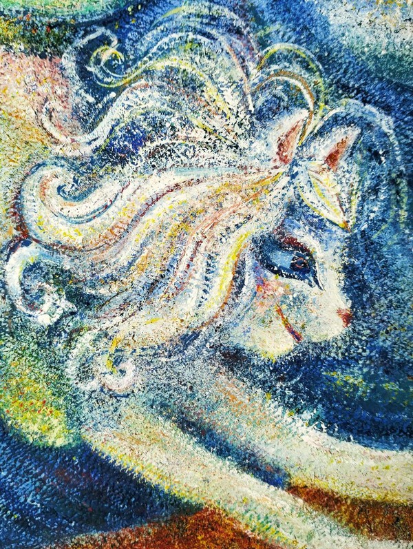 Я создала 14 иллюстраций к сценарию диснеевской «Русалочки», вдохновившись картинами чудесного художника XX века Марка Шагала. Правда, мои герои перенеслись в другую вселенную, где стали животными, а главная героиня изначально не являлась русалкой, ею она всегда мечтала стать. Я работала гуашью, стараясь меньше использовать воду, чтобы на листе была видна текстура, к тому же сухая кисть позволяла изобразить лёгкую сказочную дымку.
