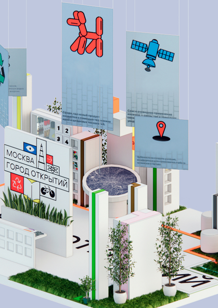 В проекте разработаны 2 концепции стендов для проекта «Город Открытий» Креативной лаборатории. В двух стендах присутствует единство дизайна. Используются арт-объекты: ячейки, в которых присутствует детальная визуализация определенных мест, и ветки метро, которые также являются навигацией в стендах.