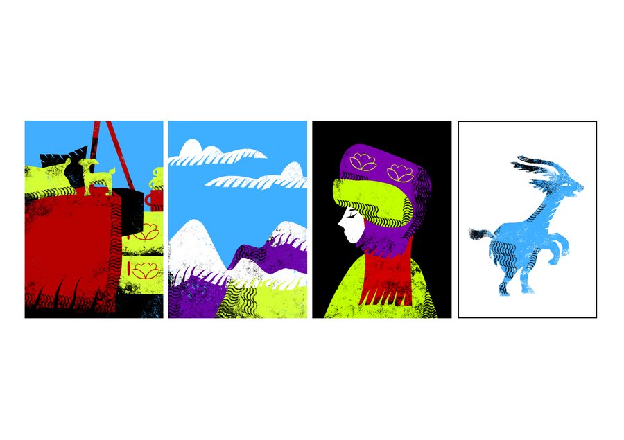 серия лаконичных футболок и открыток с элементами иллюстраций о камнерезном искусстве тувы. логотип накладывается на рисунки подобно печати мастера на изделие, рассматривая традиционное новым взглядом