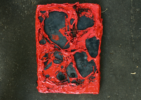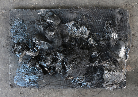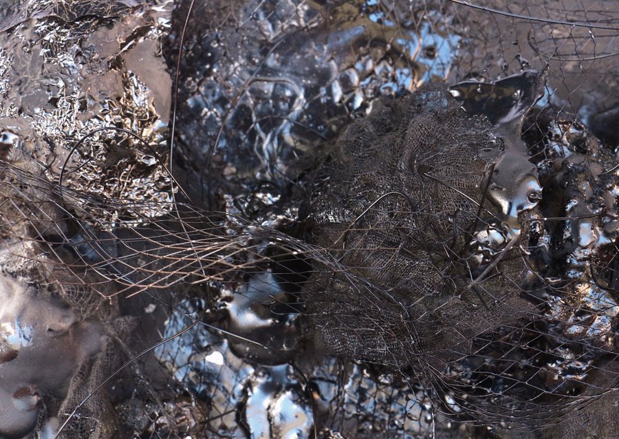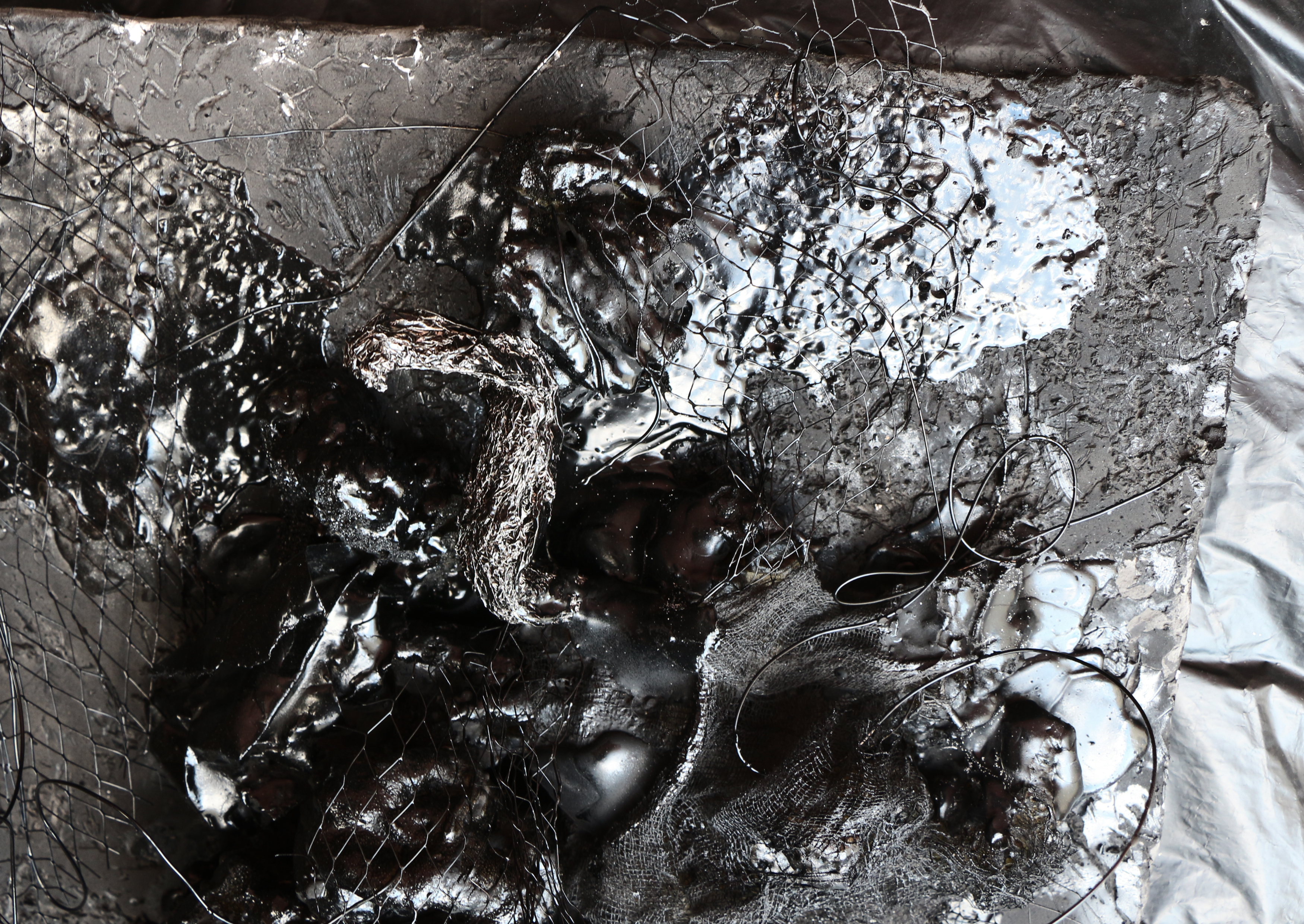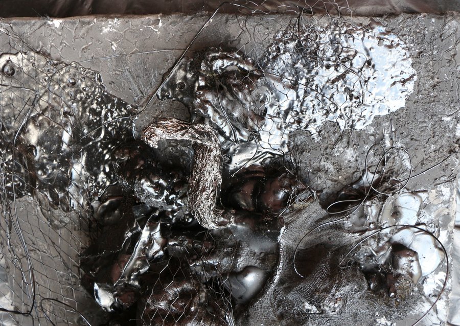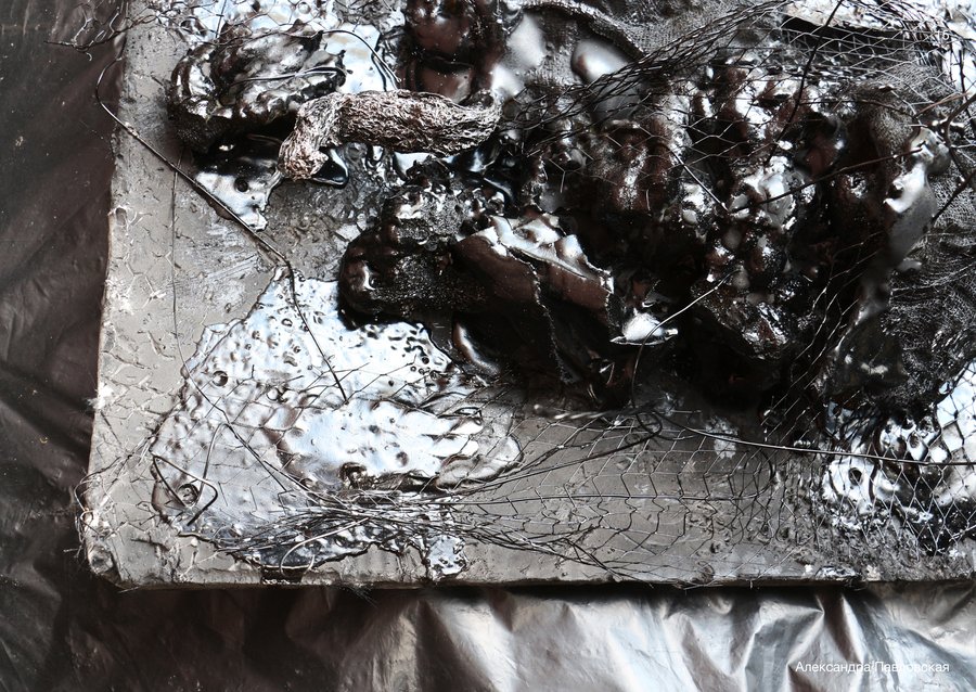 420×594 мм. Основа из гипса, глянцевая черная эмаль, покрытие из сетки, марли, фольги, проволоки, монтажной пены, кусков пластика.