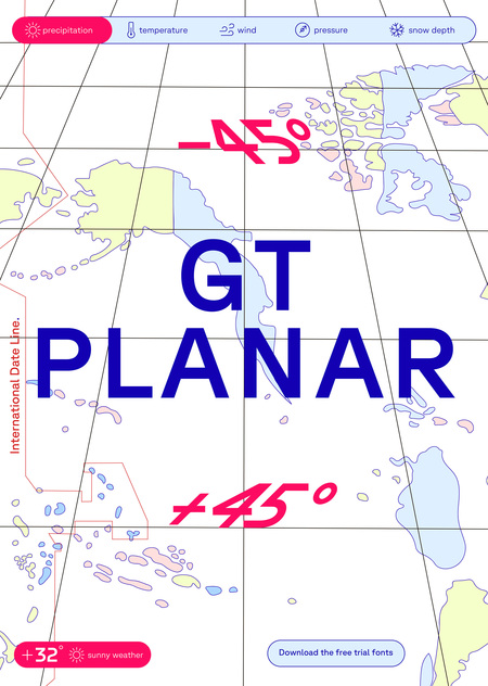 GT Planar — шрифт 90-градусного диапазона, объединяет стили Retalic, Upright и Italic в одно непрерывное дизайнерское пространство. Он плавно переходит от -45° Retalic к +45° Italic, сохраняя при этом свою целостность. Главное достоинство этого шрифта — его функциональность, независимо от длины, размера или угла наклона.