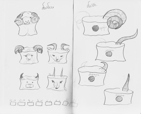 Эскизы — альчики с вылепленными мордами животных, чьи костяшки используются для изготовления игры