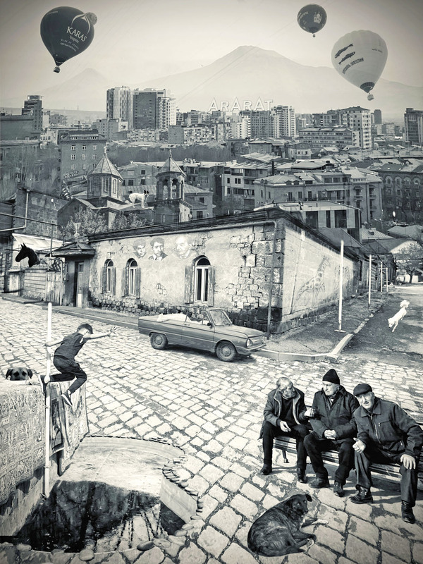 Этот коллаж сделан из фотографий, которые я сделала после своего переезда в Ереван летом 2022 года. Фоновая фотография- пустынный перекресток в Гюмри, на который я потом добавила обитателей, церковь, виды Еревана, жирафов на стене, трех армянских поэтов, шары с праздника воздушных шаров, и, конечно же, Арарат!