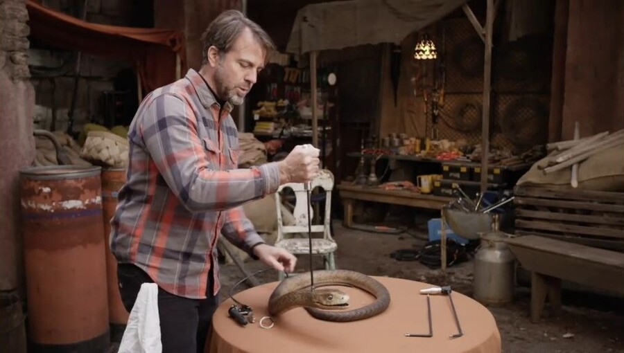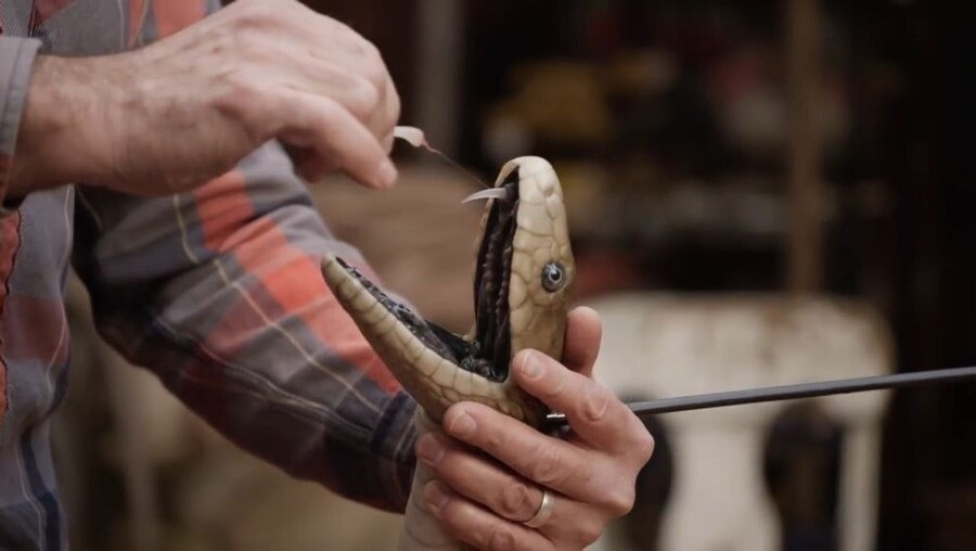 Сотрудник «Legacy Effects» показывает механизм работы куклы змеи