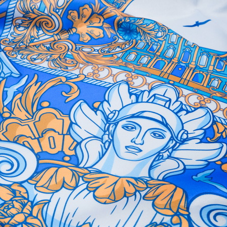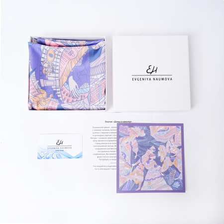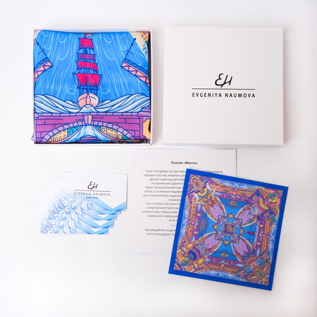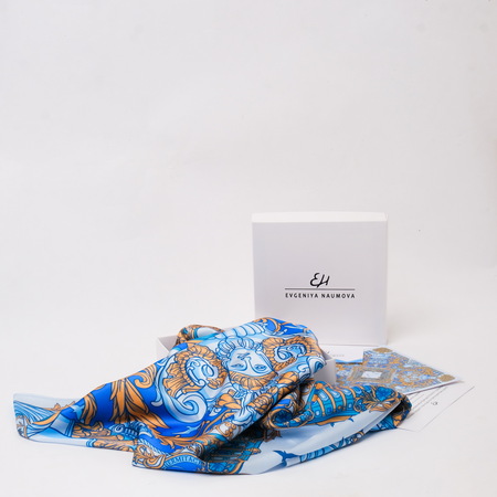 The prints were created primarily for decorative women’s scarves. This is a completed project, created in 2022. All motifs are drawn by hand, and then arranged and processed on a computer. Printed using sublimation printing technique on premium quality artificial silk in St. Petersburg. Size 90×90cm. Branded packaging was developed for the scarves. Retail price 4200 rub. Designs can also be used for panels in the interior, interior textiles — curtains, pillows, upholstery, etc. — this direction is presented in the form of visualizations.