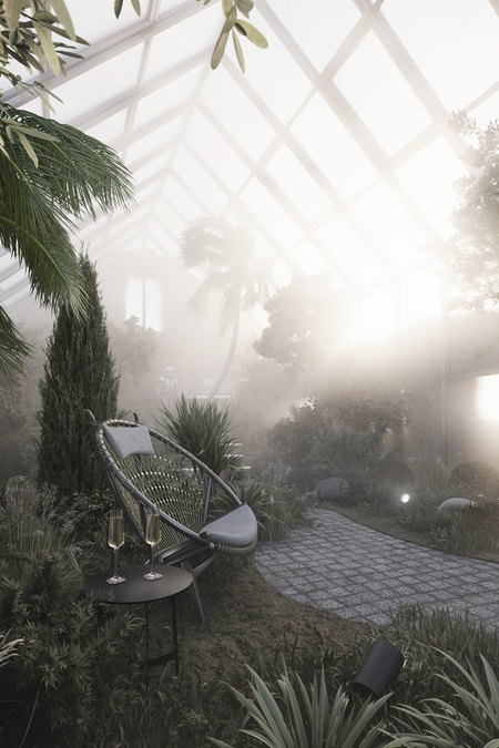 Наличие в помещениях оранжереи растений в сочетании с матовым стеклом создают невероятную иллюзию отсутствия материи и максимального объединения с природой.