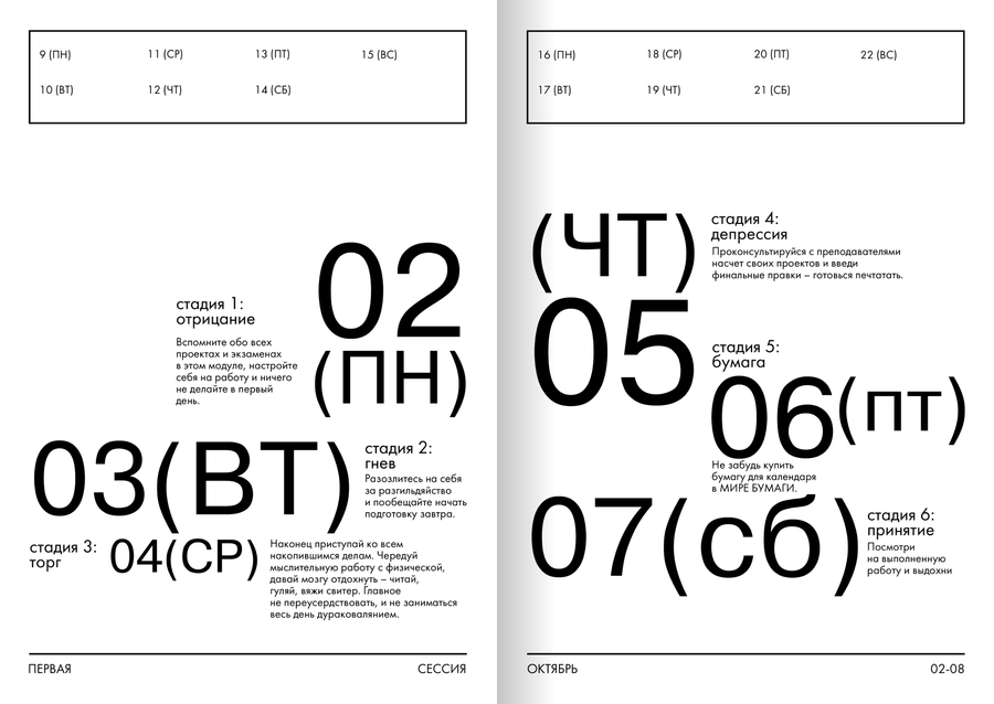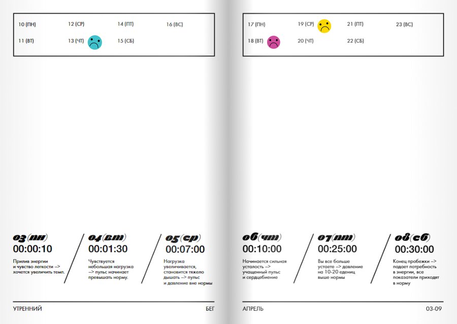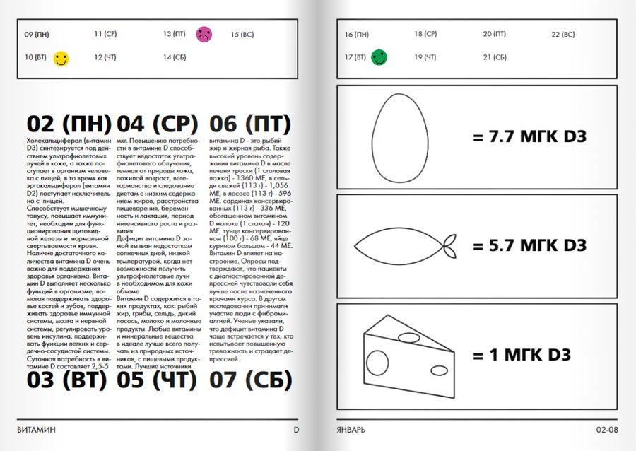 Все 12 частей календаря выполнены в виде брошюр-инструкций, начинающихся с первого понедельника месяца. Основная полоса выделена под первую неделю, рамки сверху — для заметок пользователя на последующие три. В набор так же входят стикеры, которыми можно украшать и кастомизировать свой календарь.