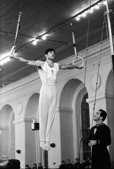 «Из залов СССР» / Чемпион СССР по спортивной гимнастике Альберт Вагаршакович Азарян на тренировке. 1953 г. Авторы фотографии неизвестны.