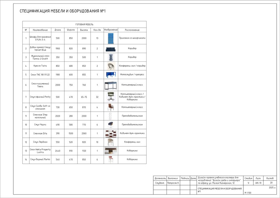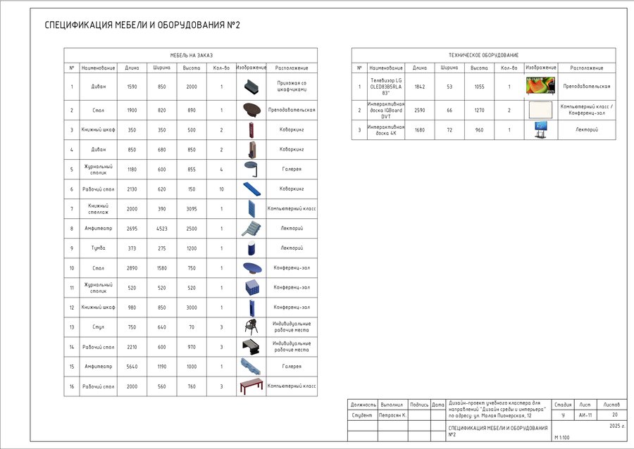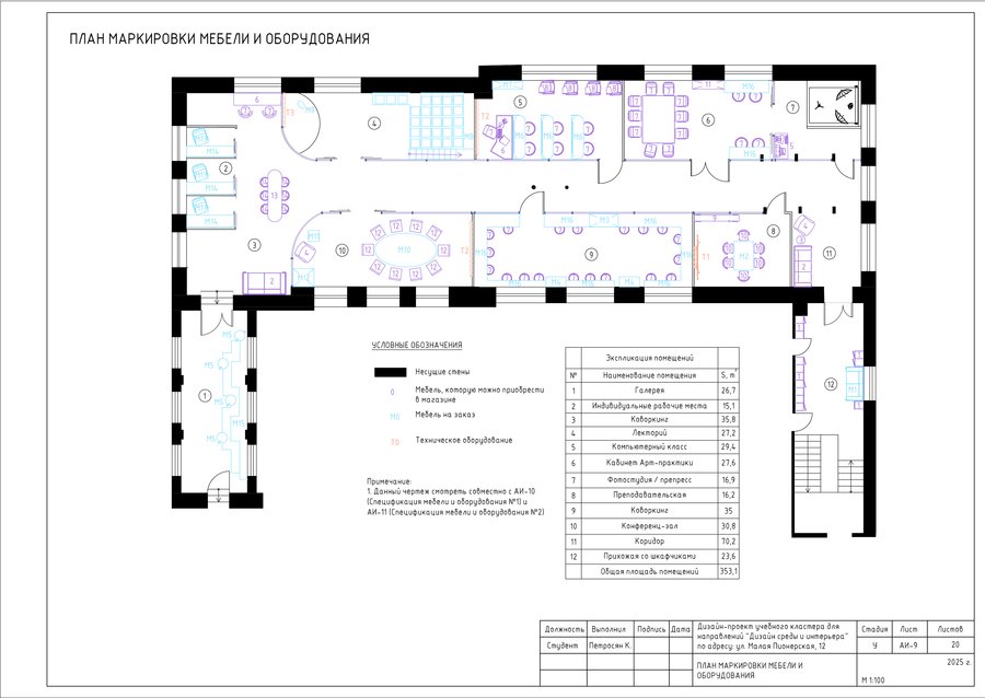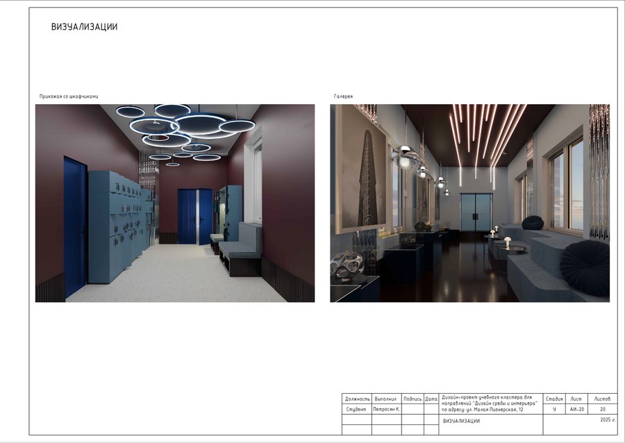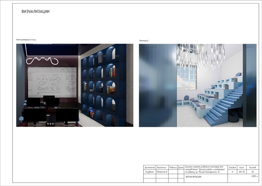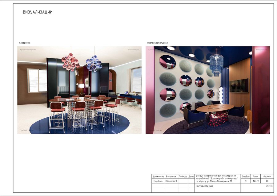 Данный проект является альбомом учебных чертежей по дисциплине «Специальные технологии», основой которого стал проект по кураторскому проектированию 1 модуля, в котором был создан учебный кластер для направления «Дизайн среды и интерьера» по адресу ул. Малая Пионерская, 12. Проект представляет собой предлагаемый вариант реновации учебного кластера, располагающегося на 4 этаже здания. Цель проекта — сделать креативное и яркое пространство, которое будет вдохновлять студентов и преподавателей. Отдельное внимание уделялось акцентным предметам интерьера, которые способствуют поднятию настроения и могут являться источником новых идей.