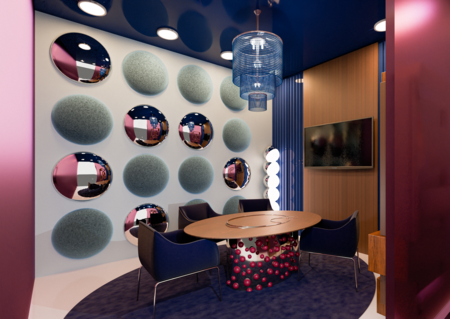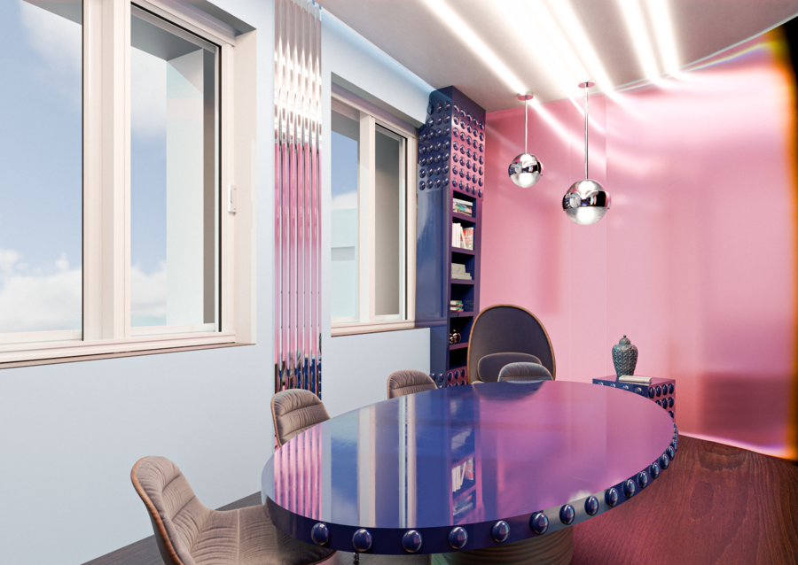 Главной особенностью этого проекта является использование сложных, глубоких цветов, а также наличие необычных предметов интерьера (см. раздел «Спецификации и габаритные схемы мебели»), разработанных специально под проект.
