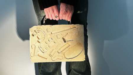 Проект исследует концепцию сумки не как модного аксессуара, а как отражения личности владельца. То, что мы носим с собой каждый день, и образует нашу повседневность. Сумка «запоминает» нас лучше, чем зеркало: она хранит следы наших привычек, решений, страхов, тревог и моментов счастья. За основу был взят хрупкий, непластичный и неживой гипс, потому что он лучше всего фиксирует мгновение, не давая времени измениться. В нашем проекте он стал слепком и архивом существования, а оттиски на поверхности — следами того, что обычно находятся внутри.